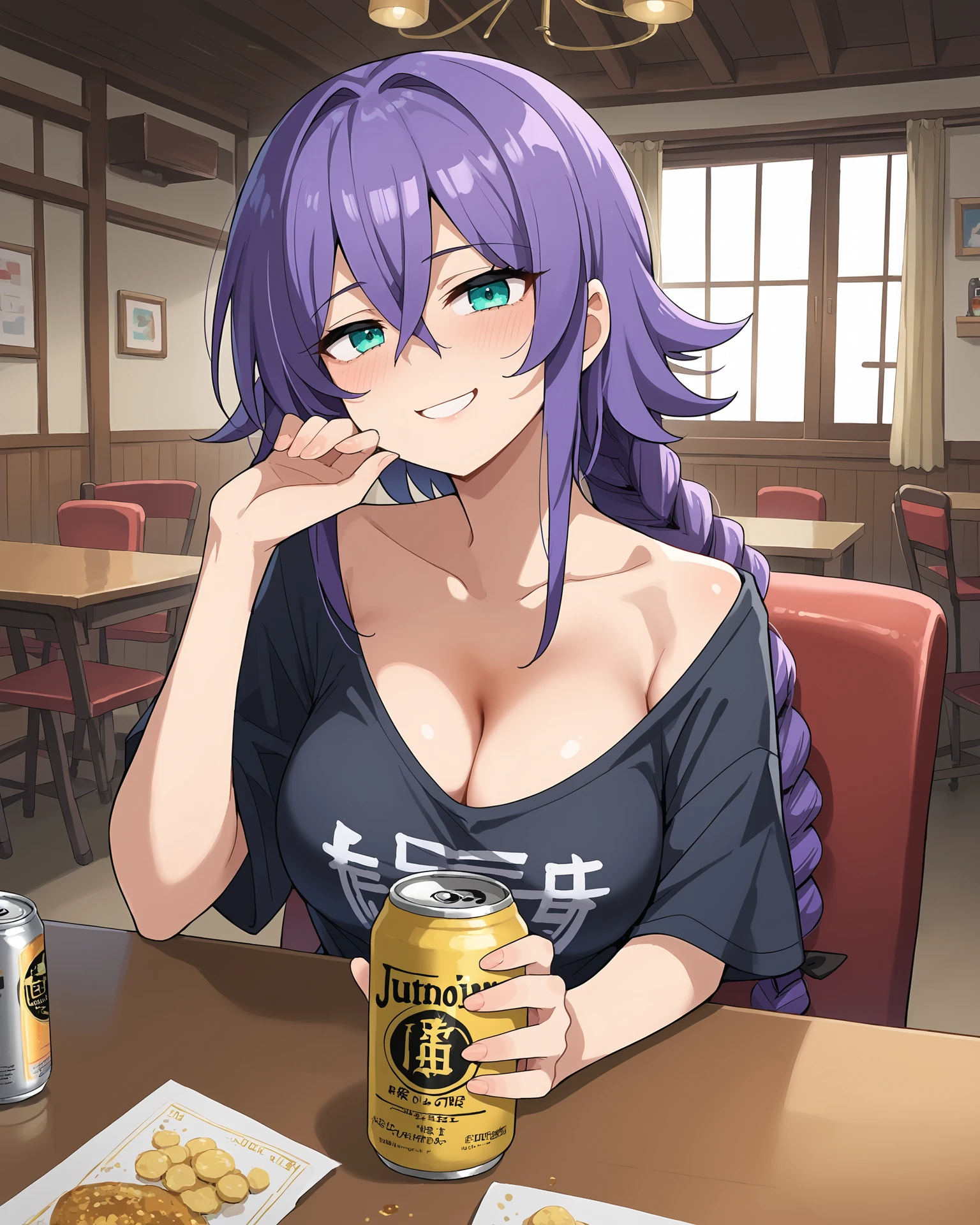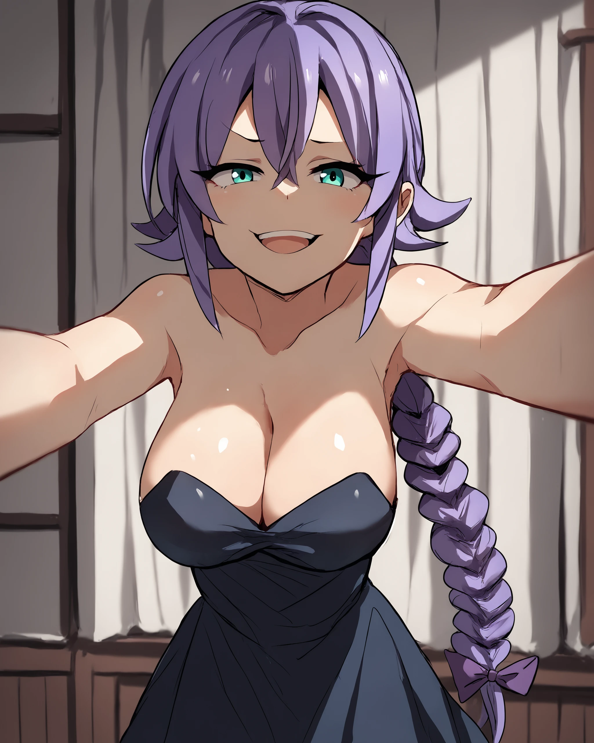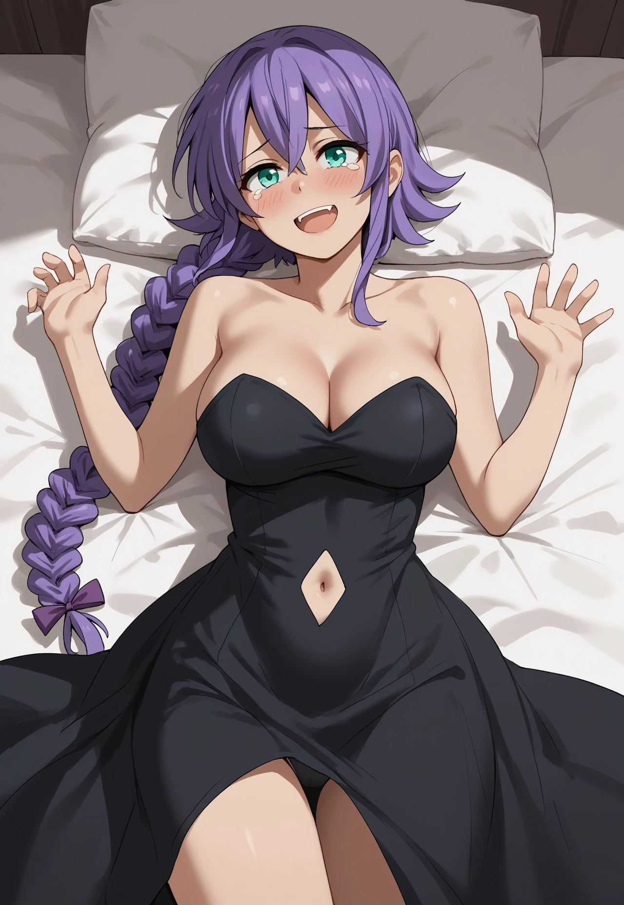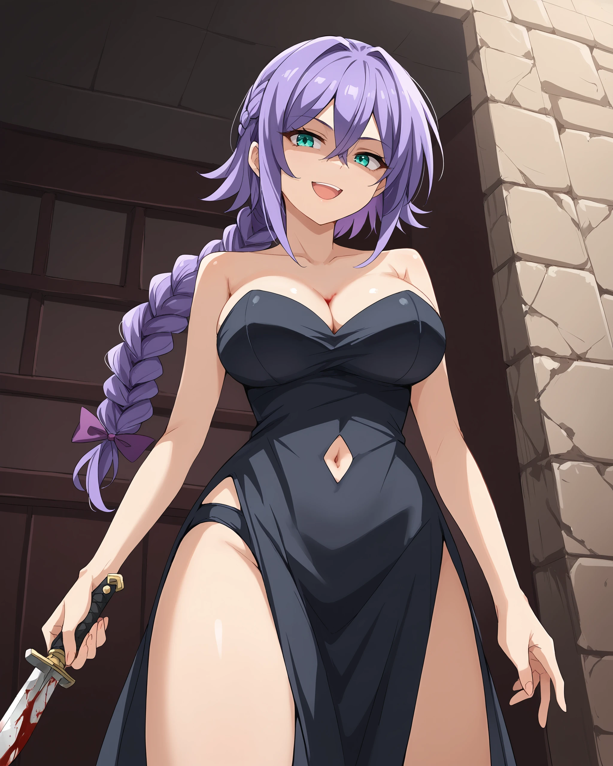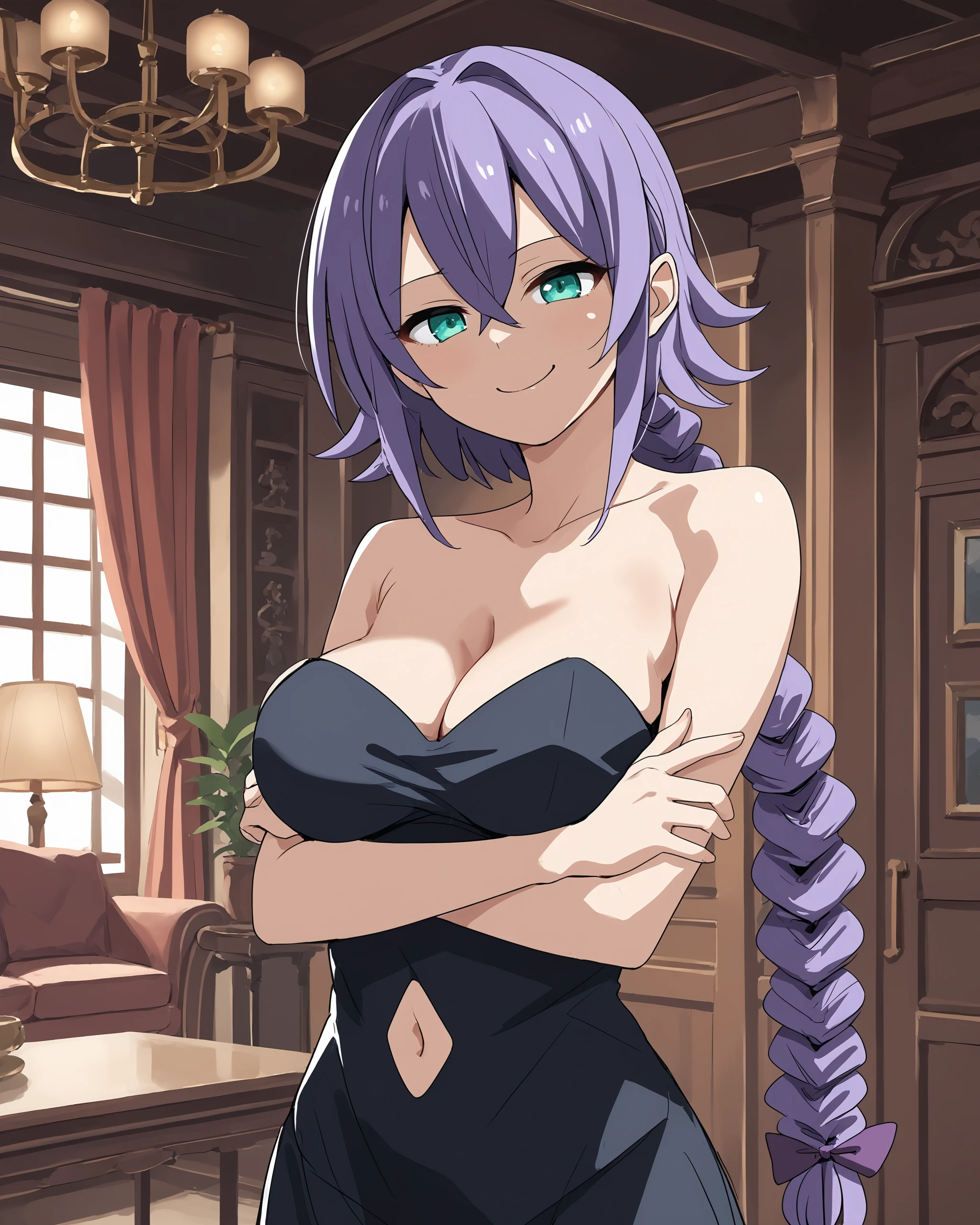 Stain4Assassin, 1girl, solo, very long hair, purple hair, hair between eyes, braided ponytail, aqua eyes, large breasts, hair ribbon,