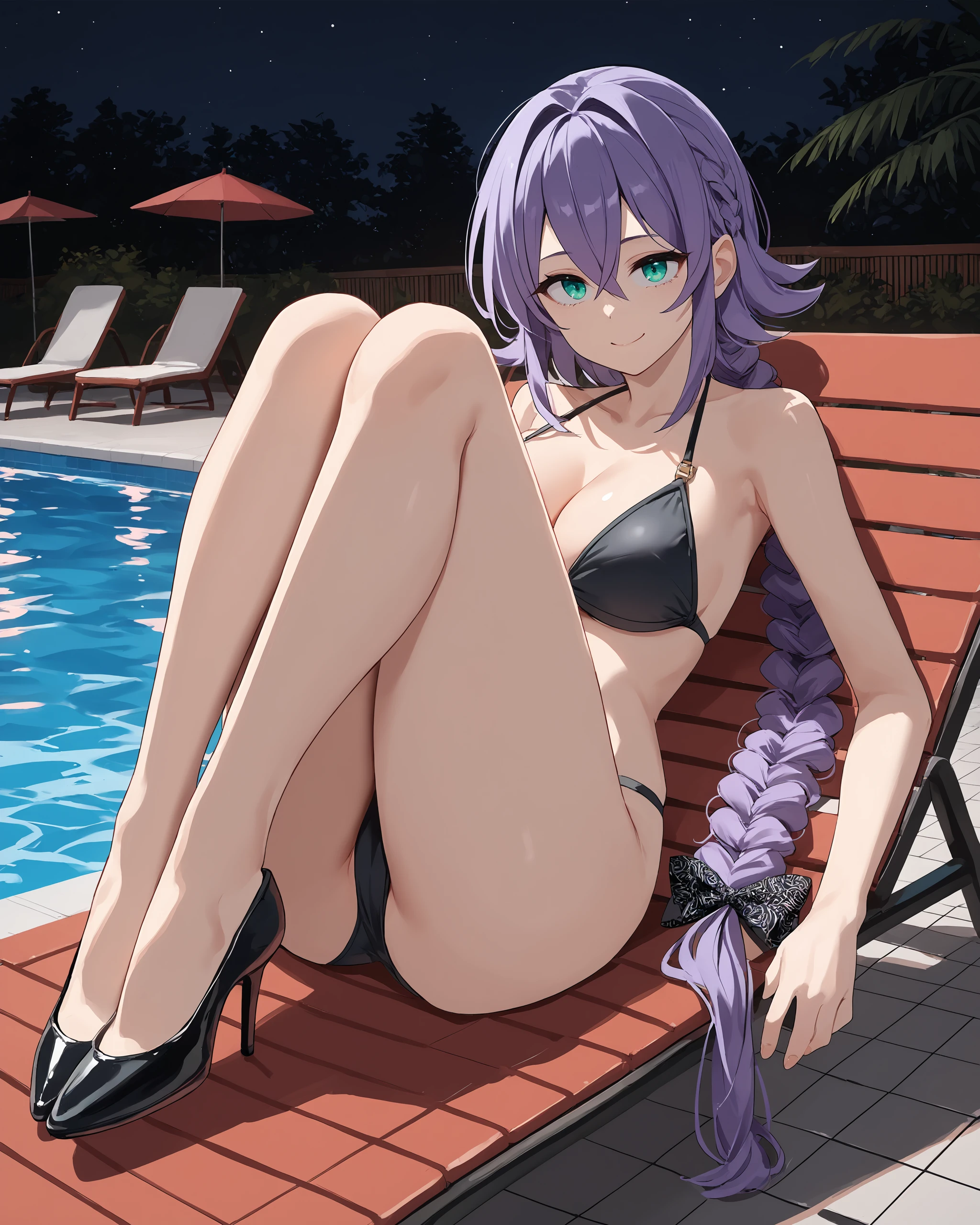 black bikini, navel, cleavage, collarbone, high heels,