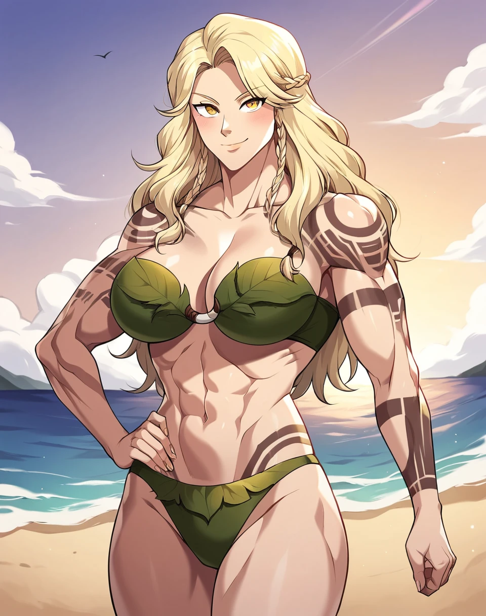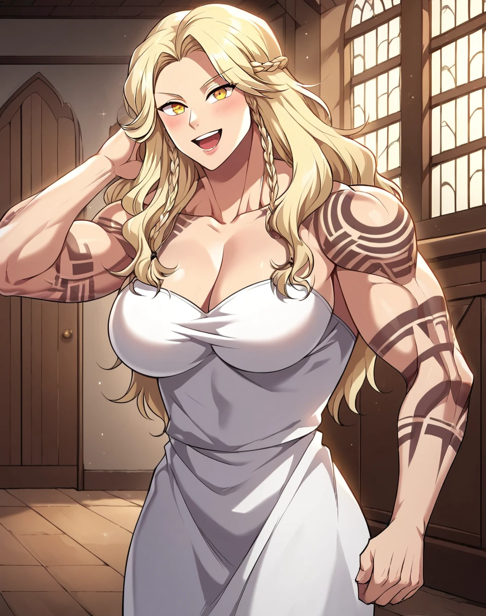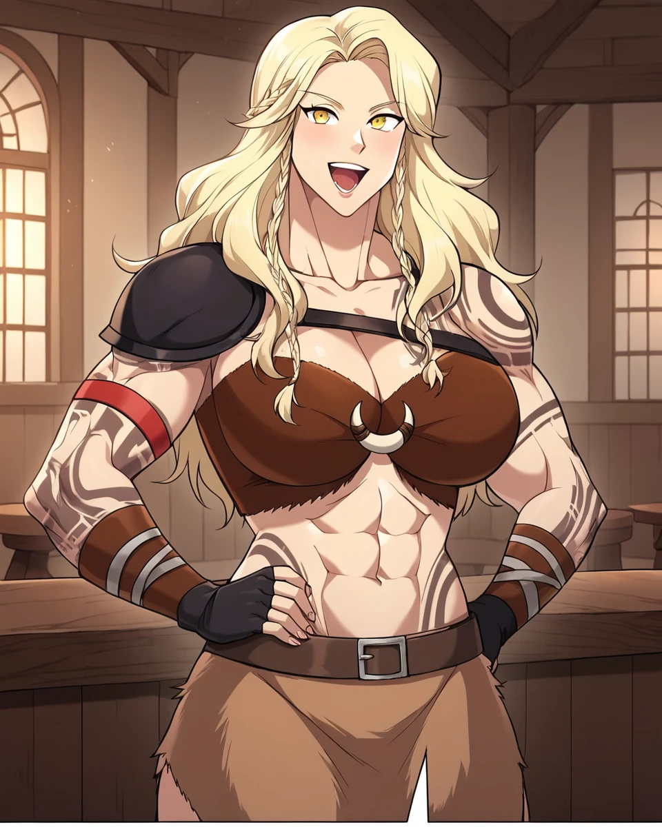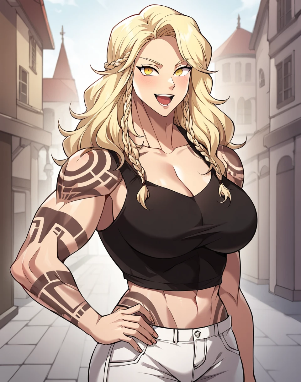 ainar_stgb, long hair, blonde hair, twin braids, braid, yellow eyes, arm tattoo, tattoo, tribal tattoo, shoulder tattoo, large breasts, muscular female, muscular, manhwa