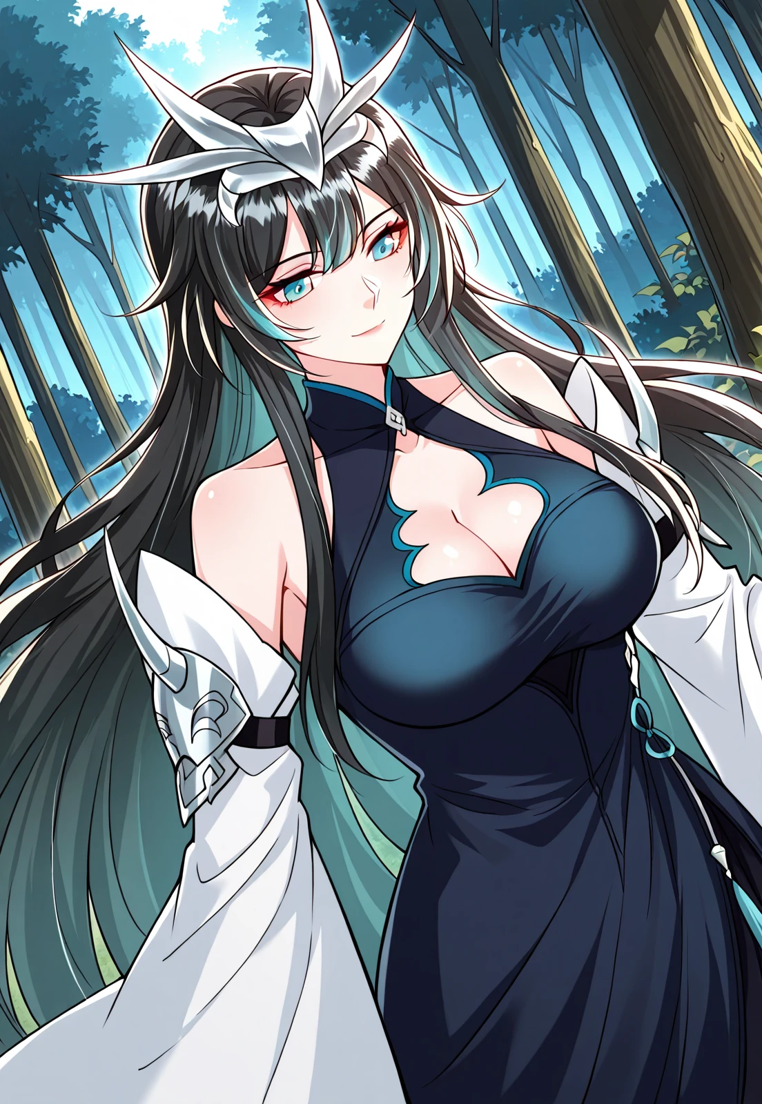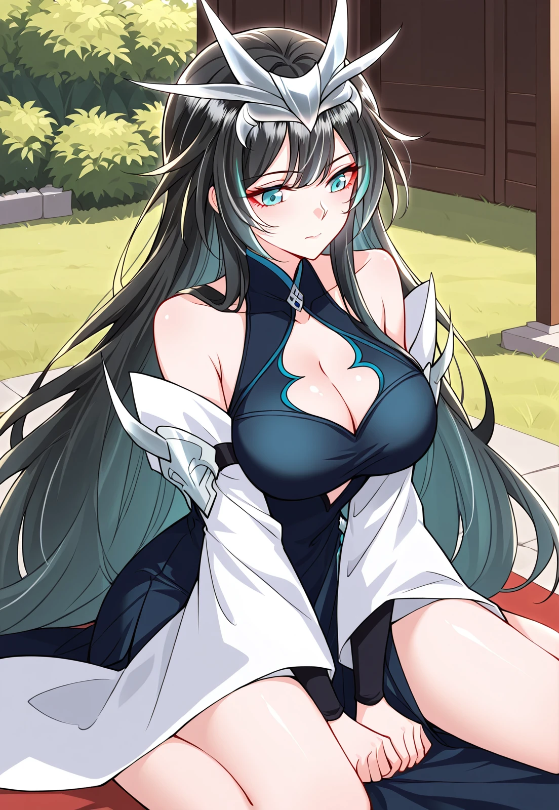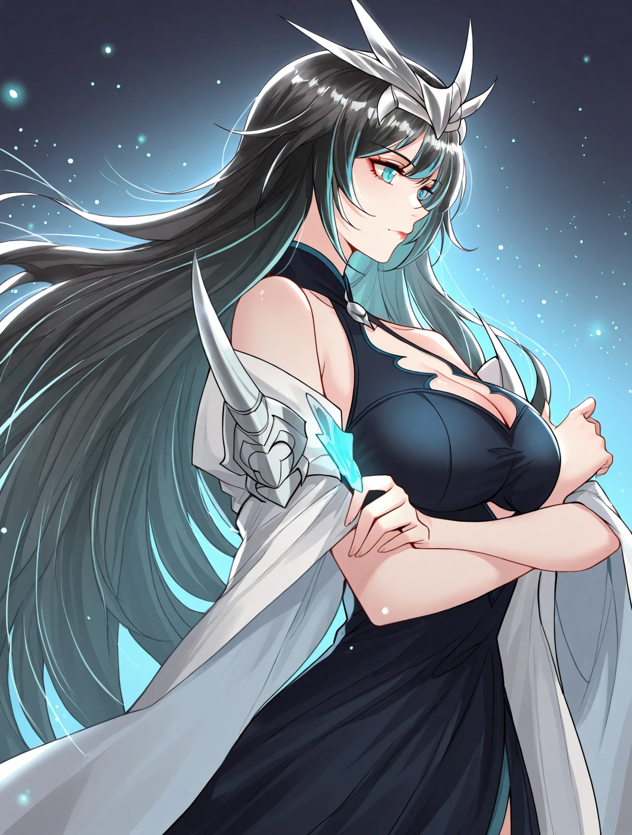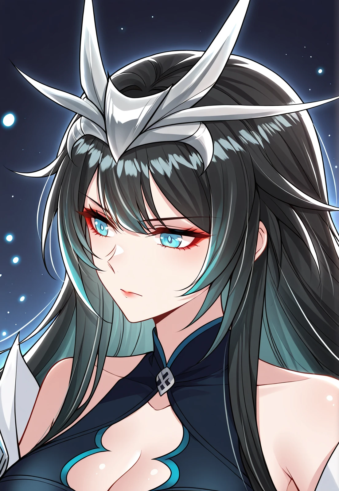 1 girl, solo, black hair, green highlights, long hair, blue eyes, long bangs, swept bangs, hair ornament, layered hair, horn crown, silver crown,