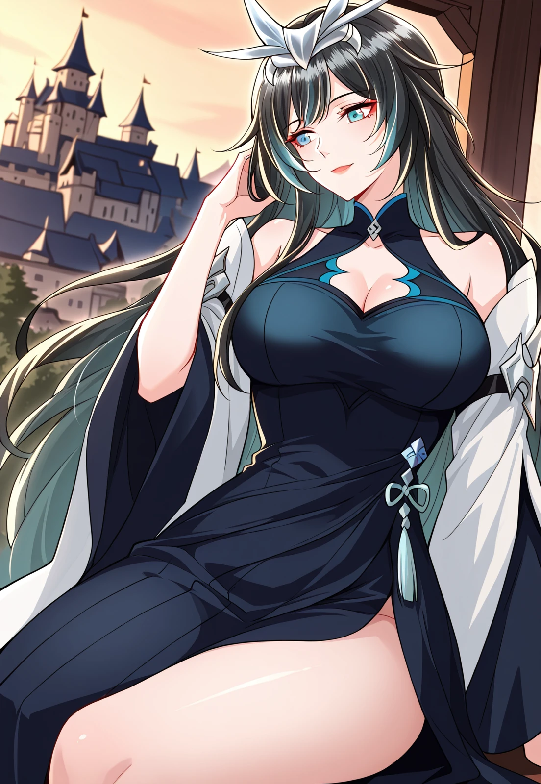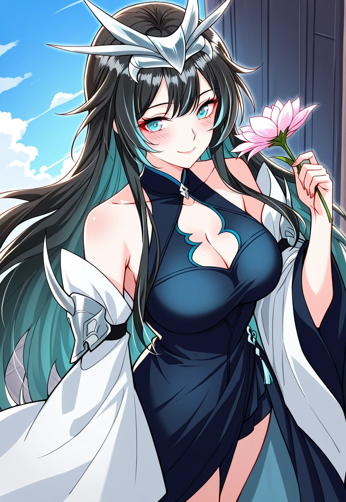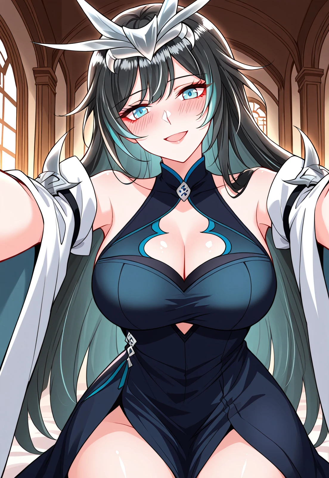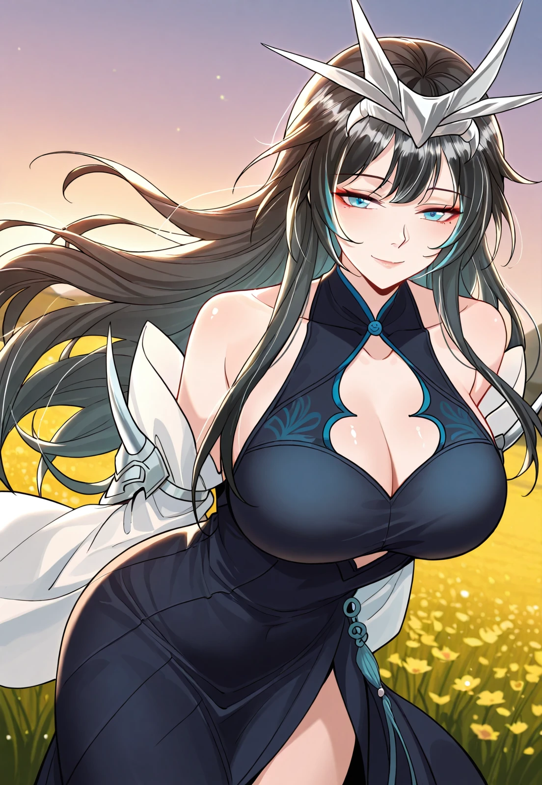 1 girl, solo, black hair, green highlights, long hair, blue eyes, long bangs, swept bangs, hair ornament, layered hair, horn crown, silver crown,