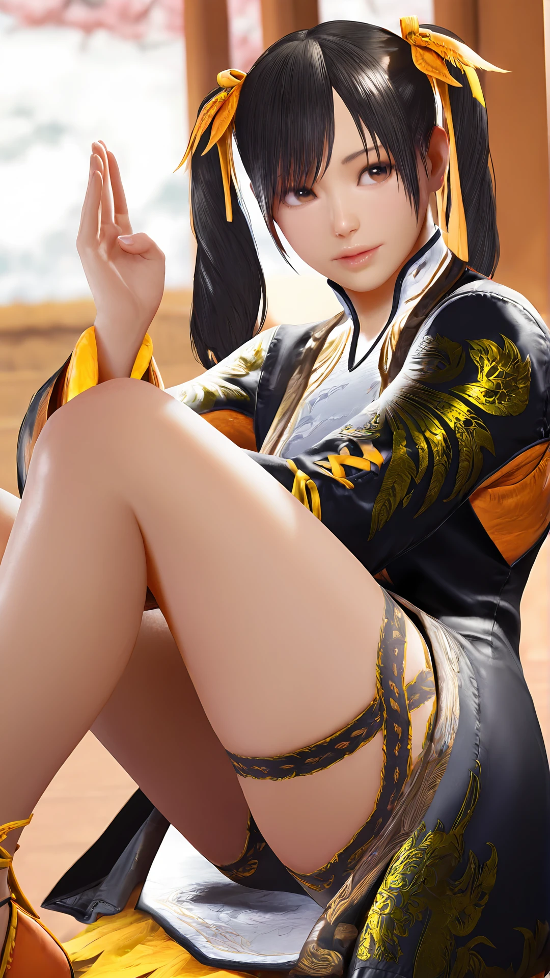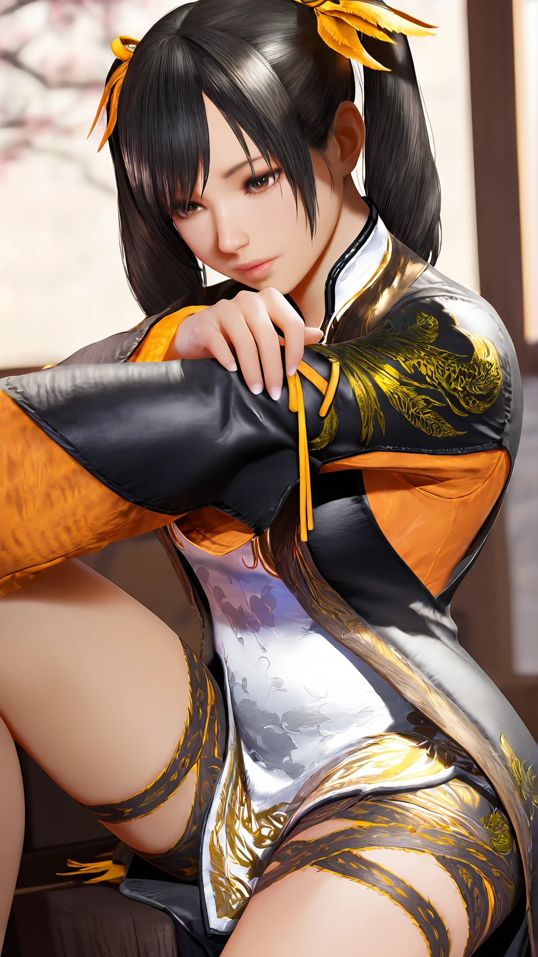 T8Lingxiaoyu, 1girl, solo, black hair, realistic, chinese clothes, dress, ponytail, hair ornament, brown eyes, long sleeves