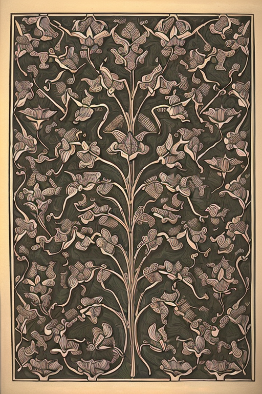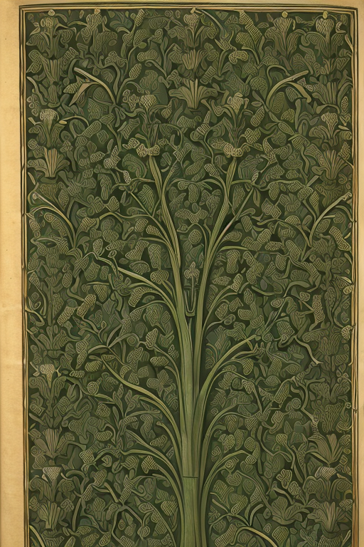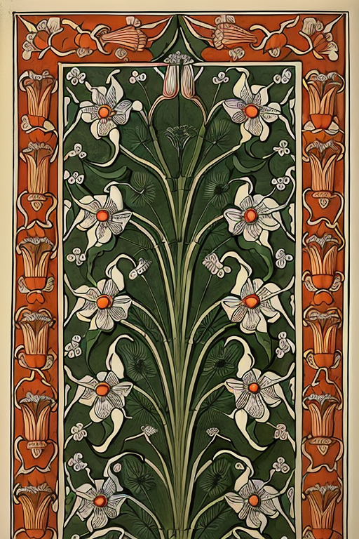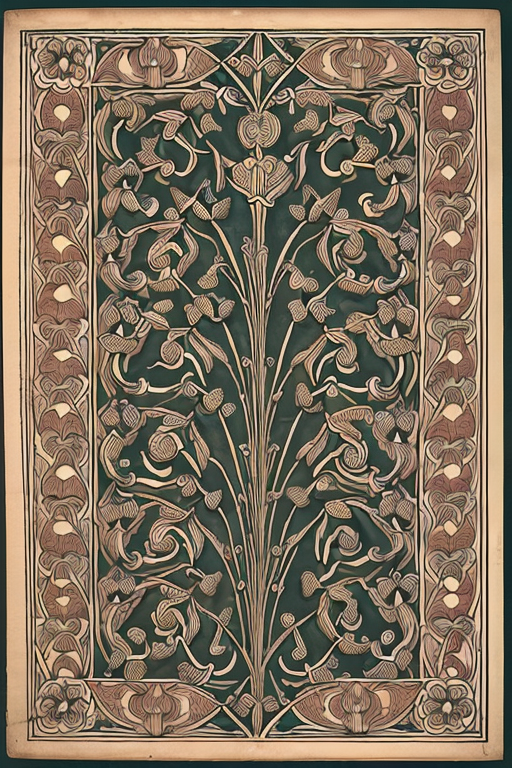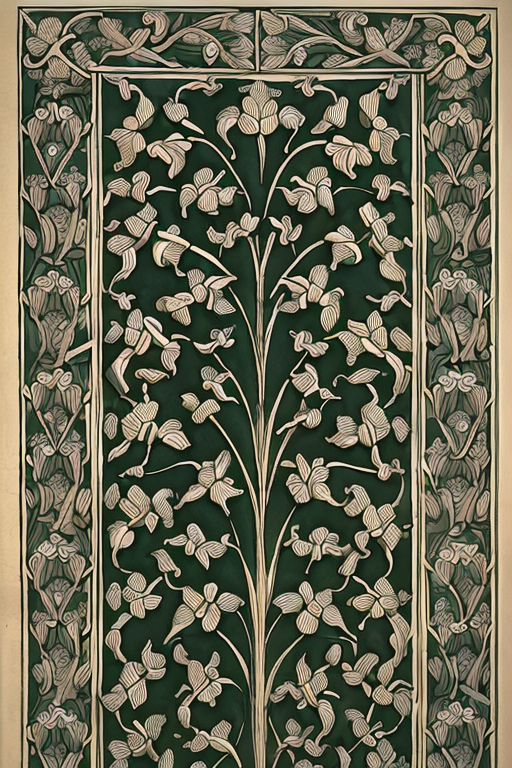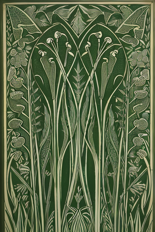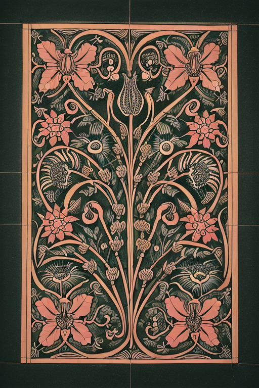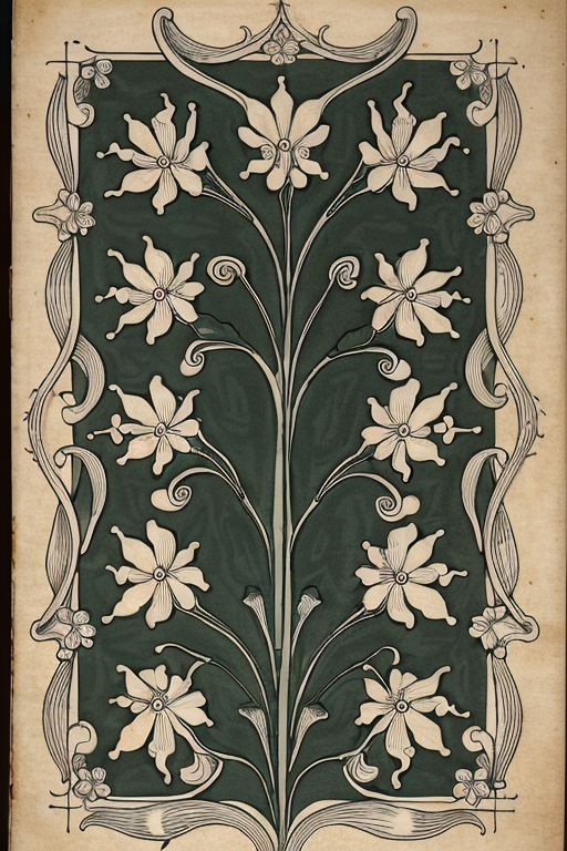 This embedding is based on 30 patterns from La plante et ses applications ornementales — cooked for a total of 300 steps on base SD 1.5: 16 vectors per token, a 0.004 learning rate, a batch size of 6, and 5 gradient steps. It can make some quite lovely patterns; with the right weights, you can also push them in a more naturalistic or abstract direction.