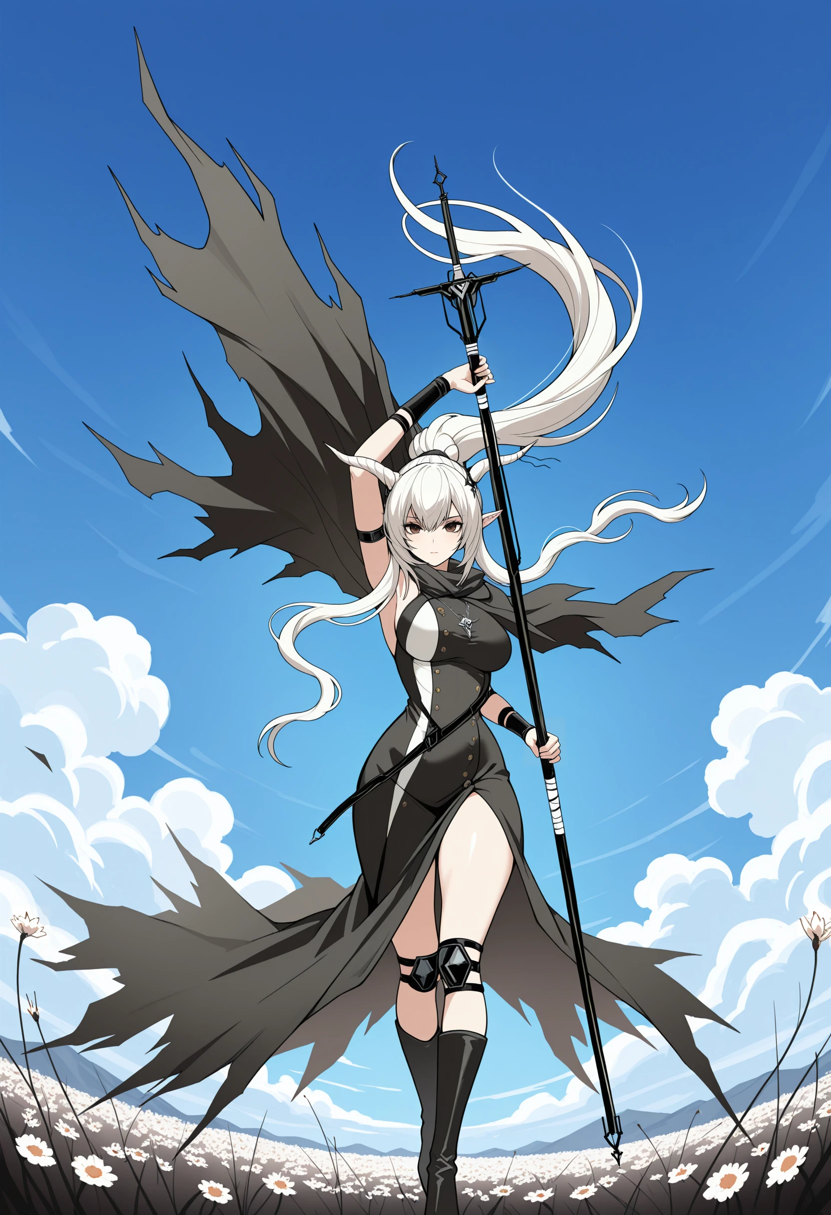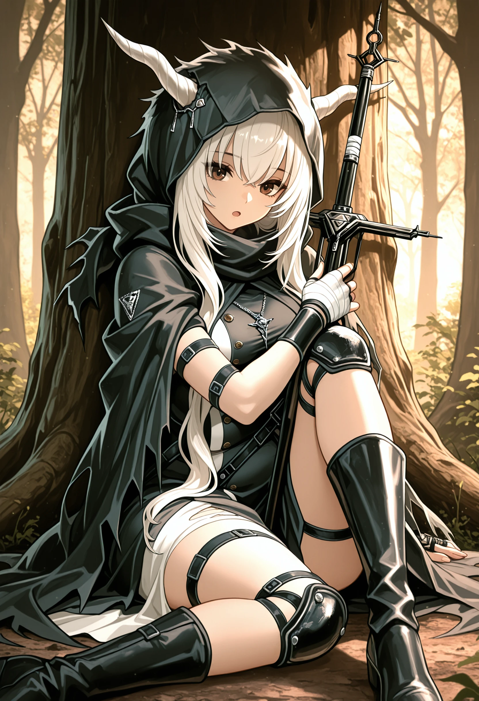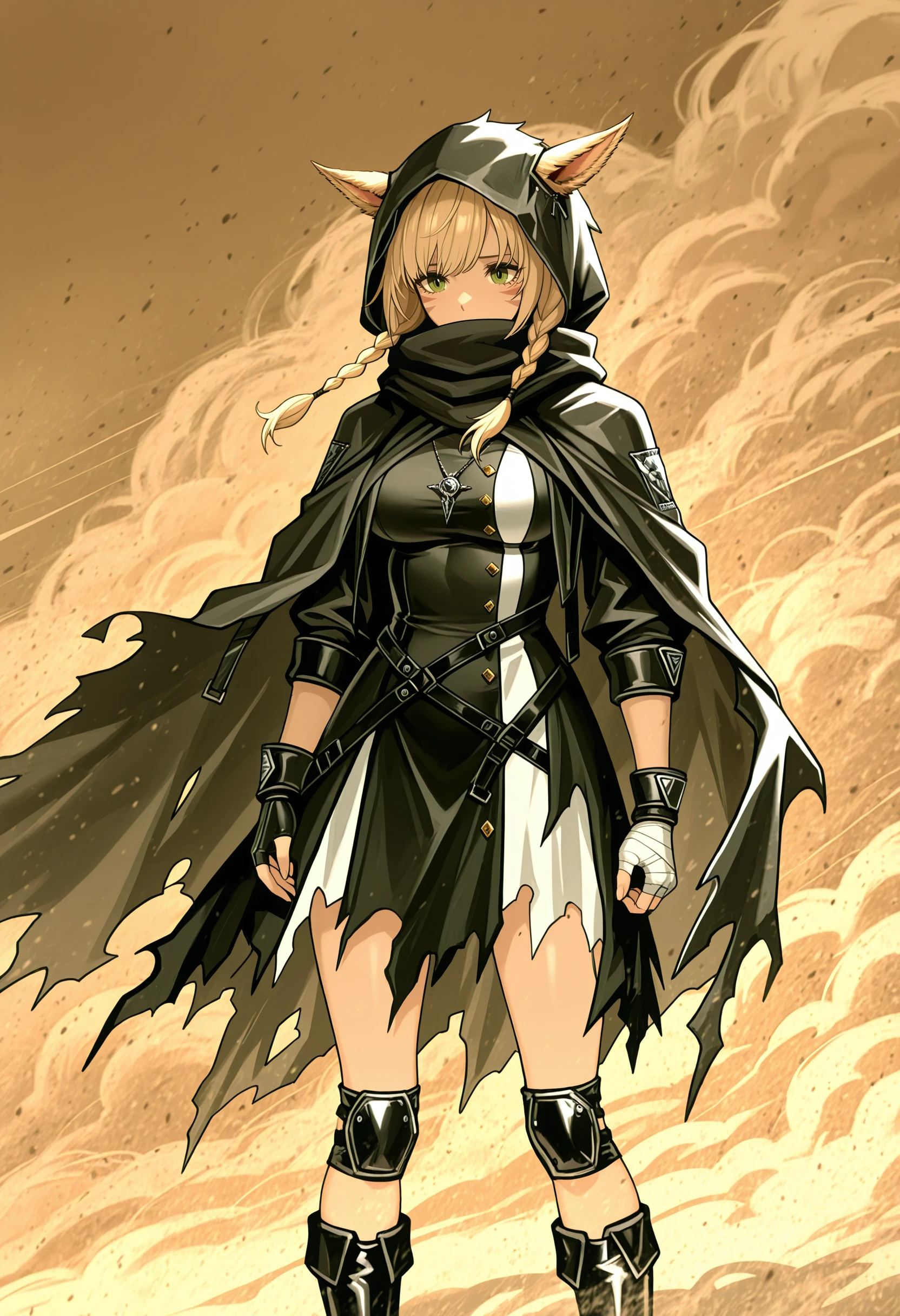 official costume, knee boots, knee pads, bandaged hand, pendant,black dress, torn clothes, hooded cloak,wristband
