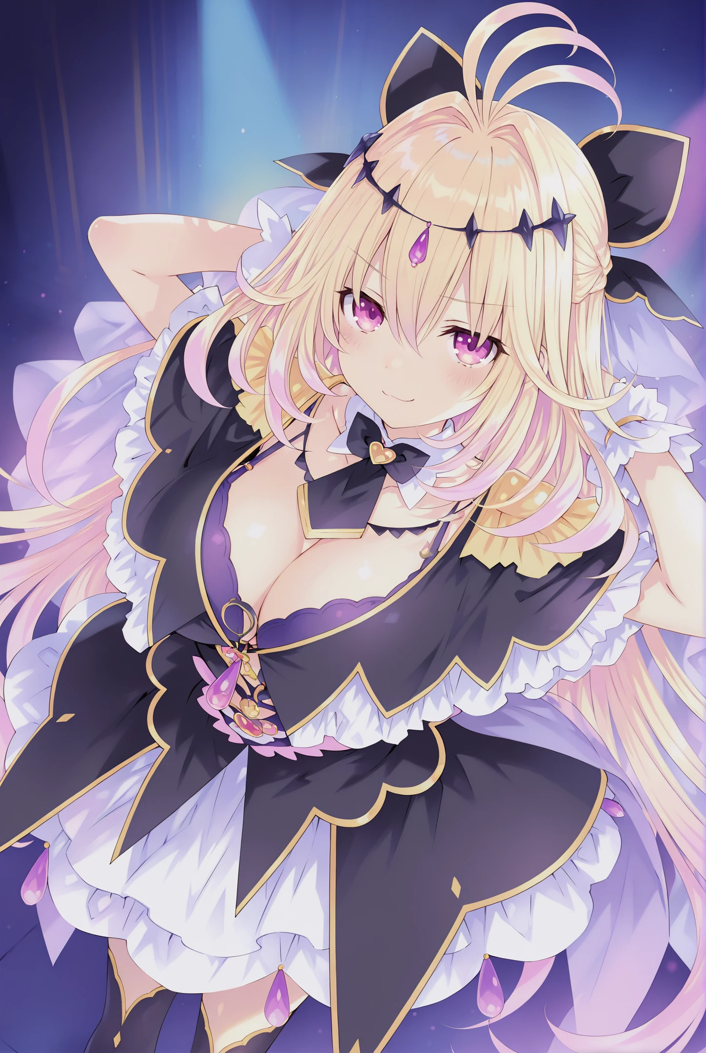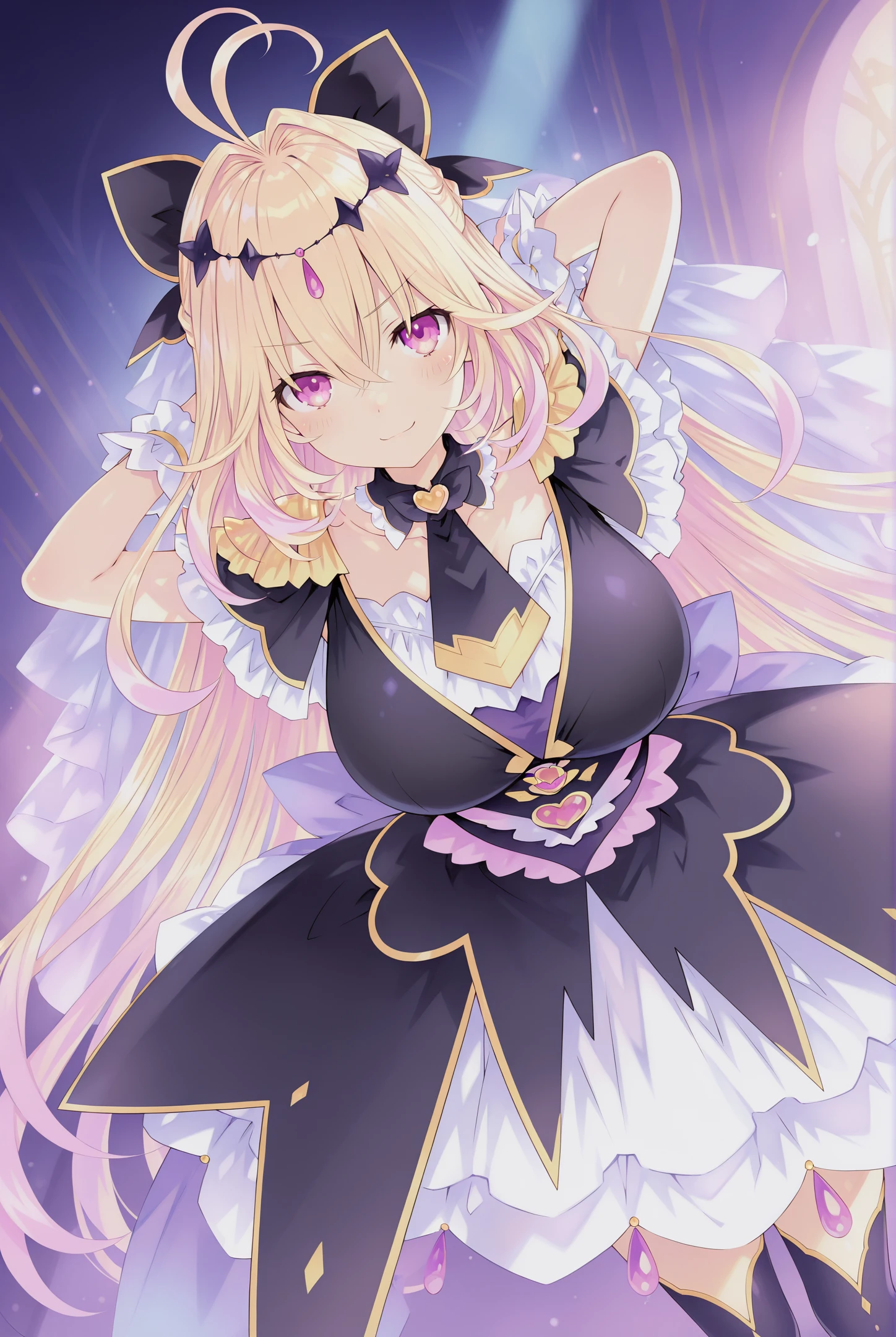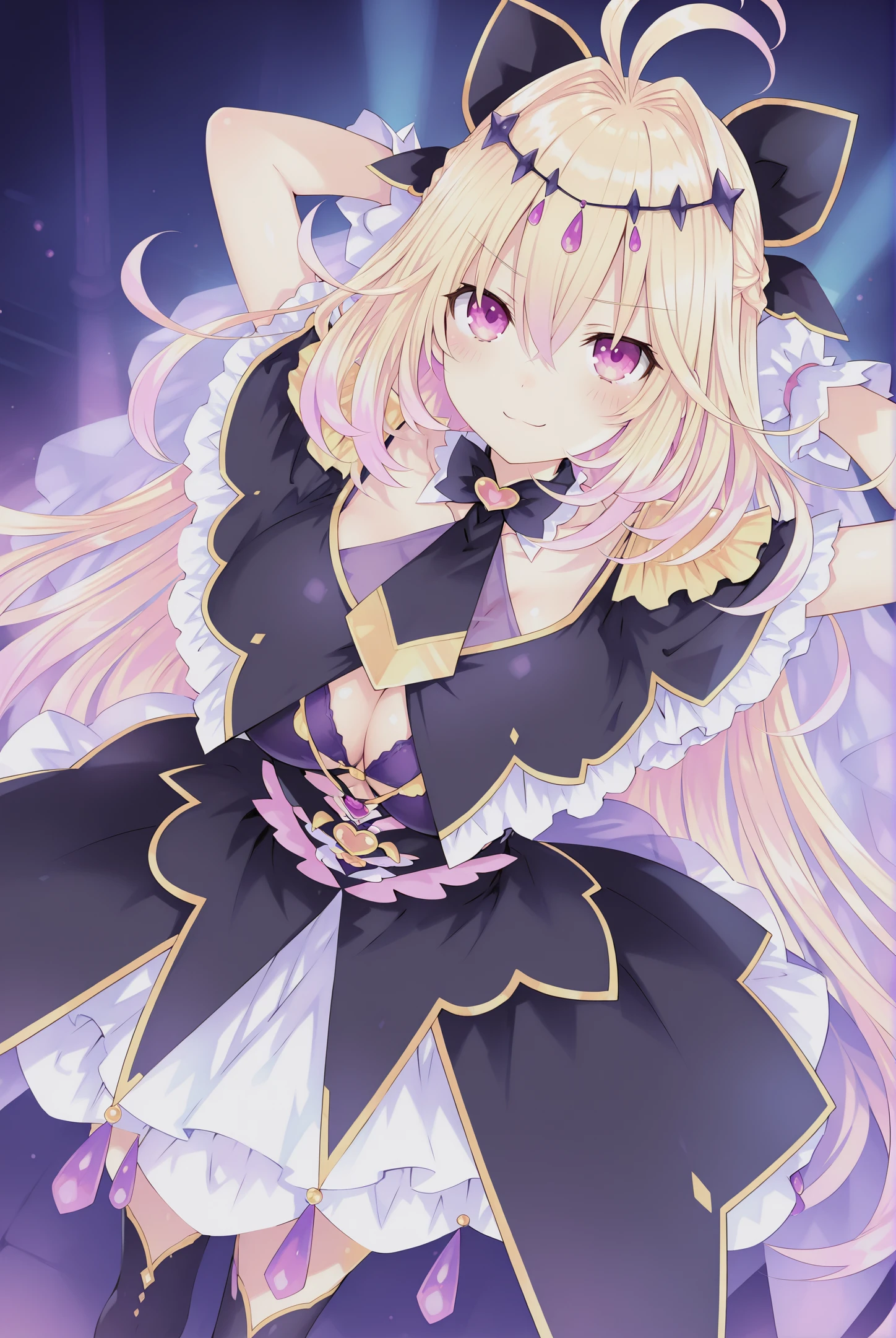 Cure Arcana Shadow,1girl,solo,blonde hair,long hair,wrist cuffs,very long hair,black footwear,multicolored hair,black dress,veil,pink hair,black thighhighs,antenna hair,magical girl,black bow,gradient hair,hair bow,pink eyes,hair between eyes,epaulettes,capelet,purple bra,dress_pendant,