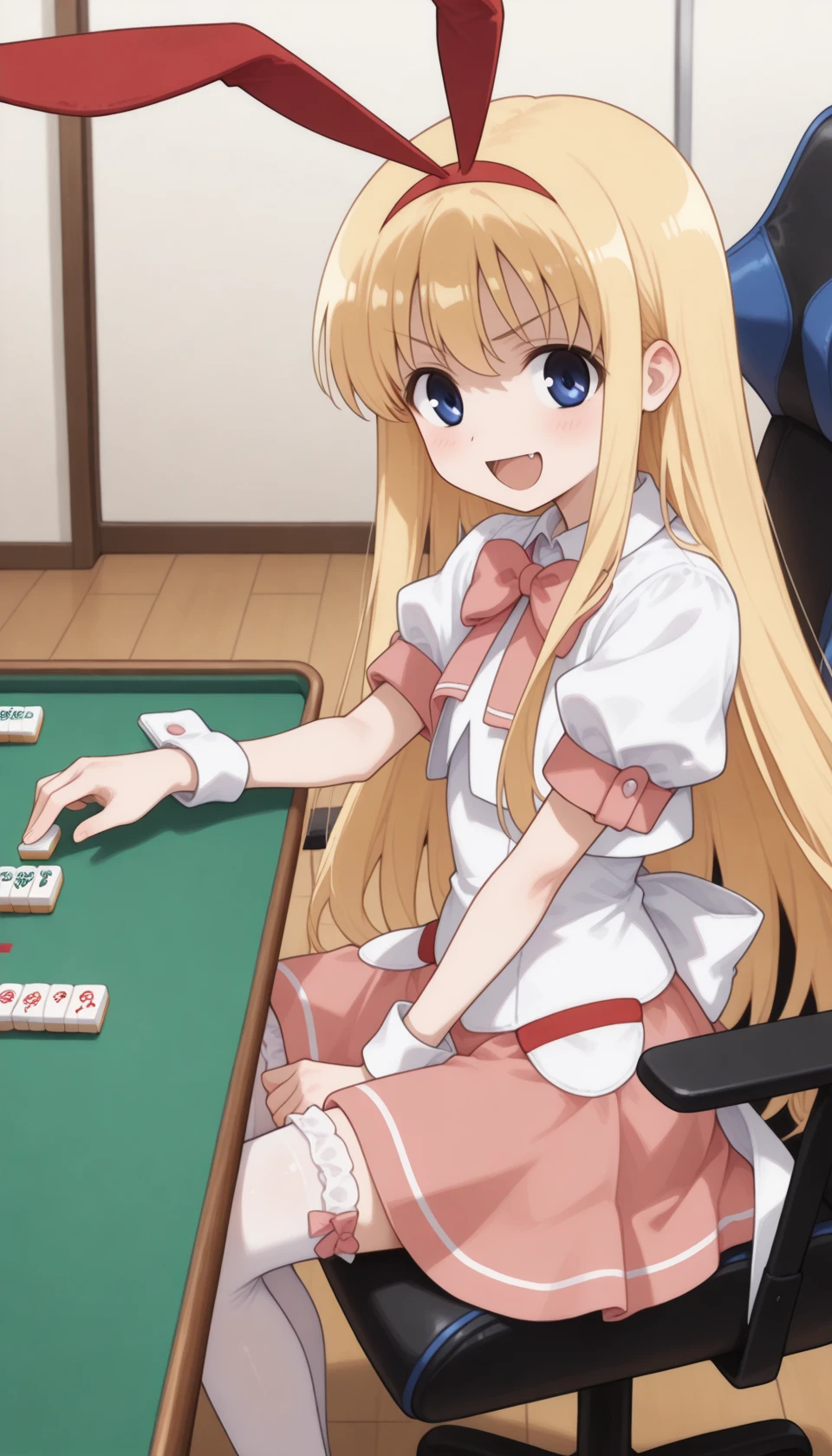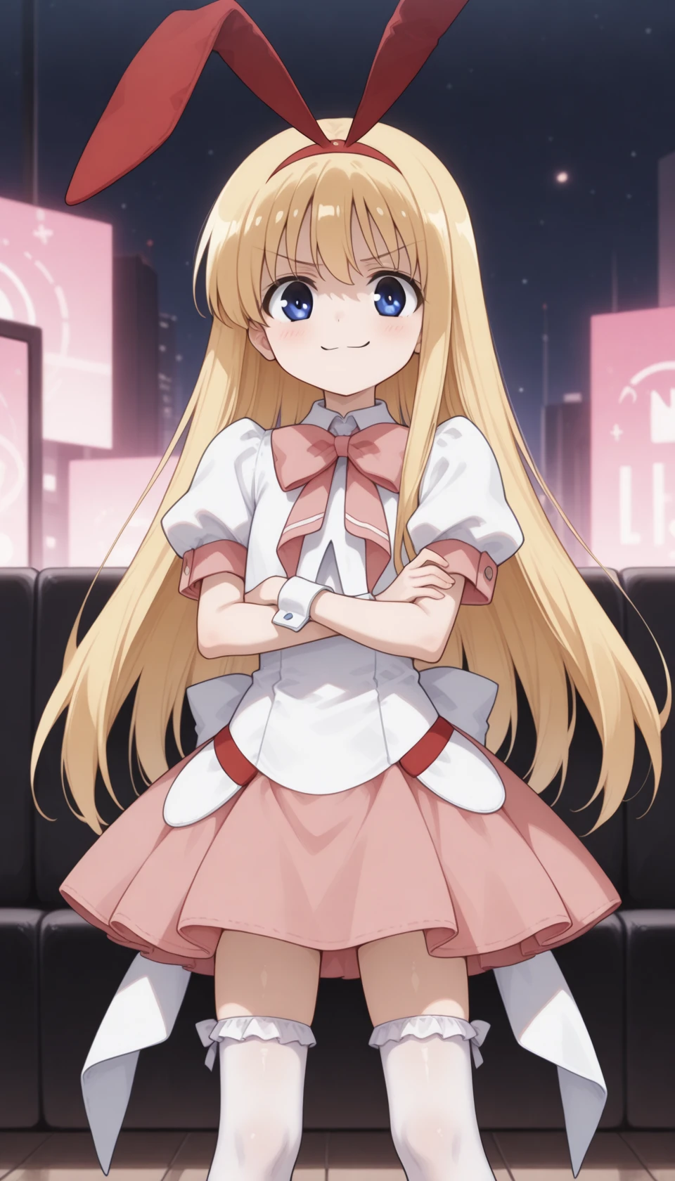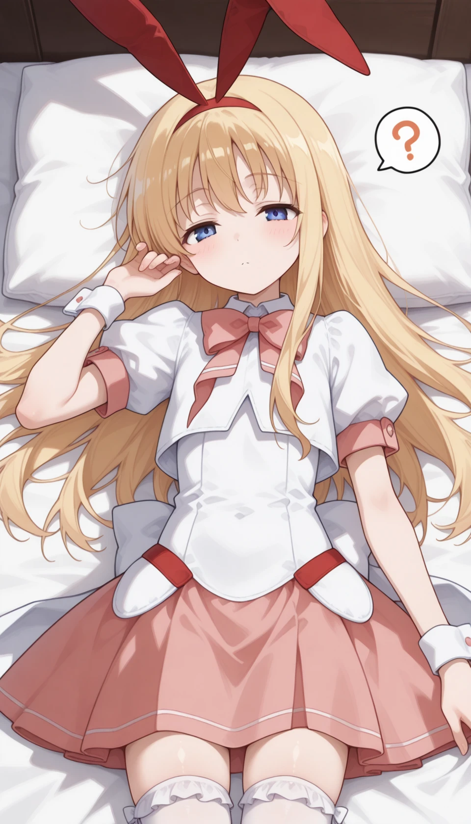 krmdef, red hairband, fake rabbit ears, white vest, white dress, pink ribbon, bowtie, puffy short sleeves, armband, skirt, pink skirt, back bow, white bow, white thighhighs, (frilled thighhighs:0.9),