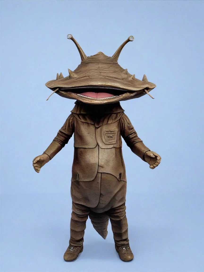 Unique Design: He has a large head shaped like a giant coin purse (Gama-guchi), complete with a zipper for a mouth.