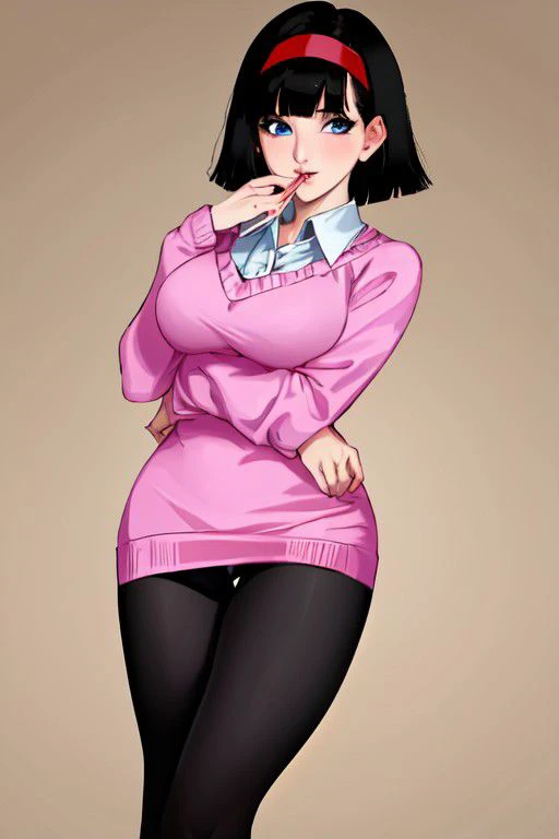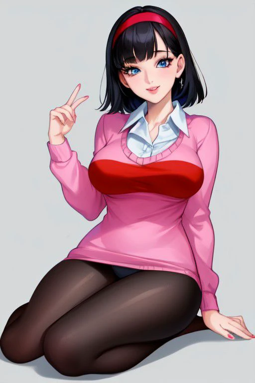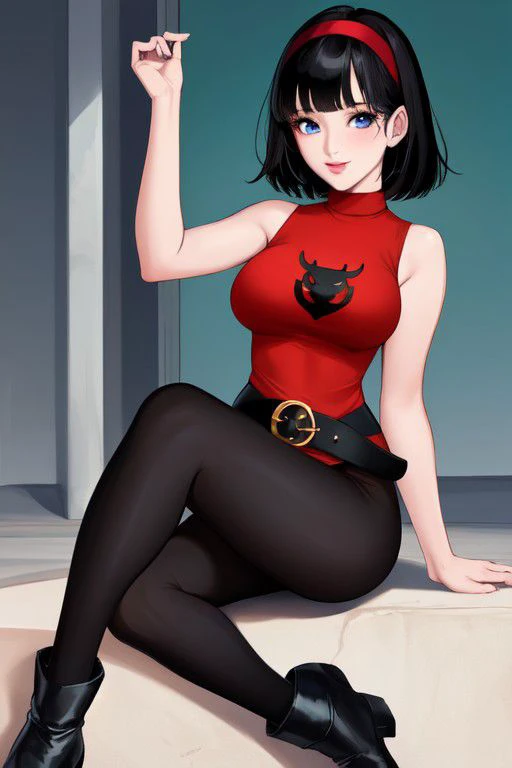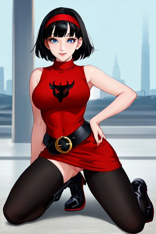 videl super,1girl, black hair, blue eyes, short hair, red hairband, short hair