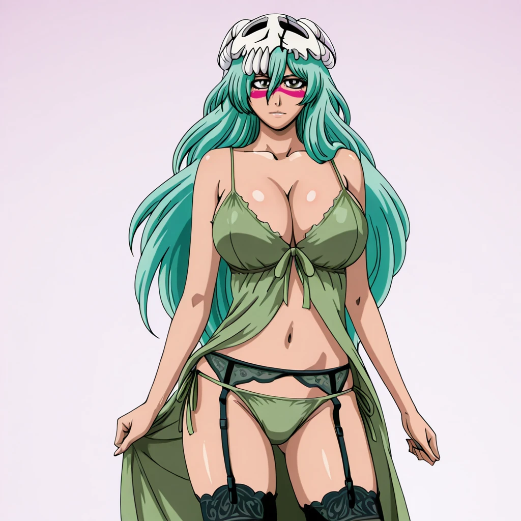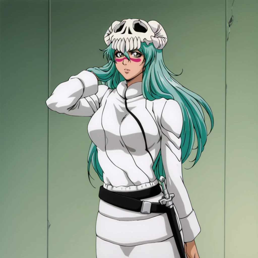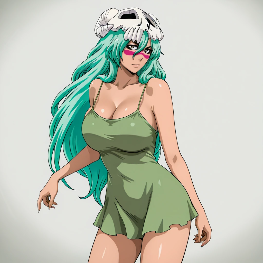 Trigger with dress: NelielBleachDress, 1girl, long hair, facial mark, retro artstyle, green hair, breasts, skull, belt