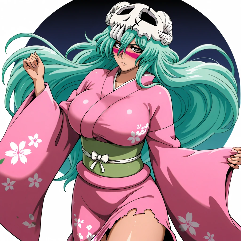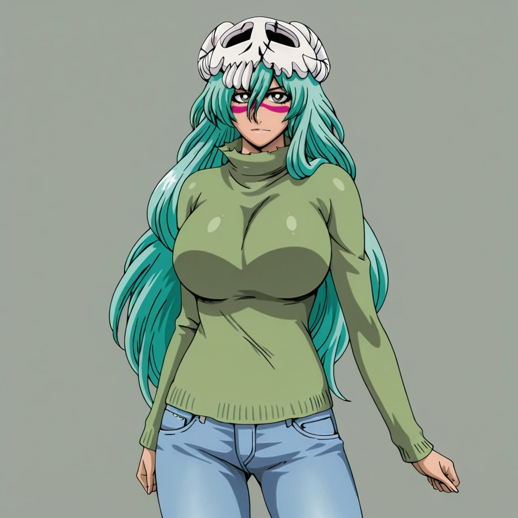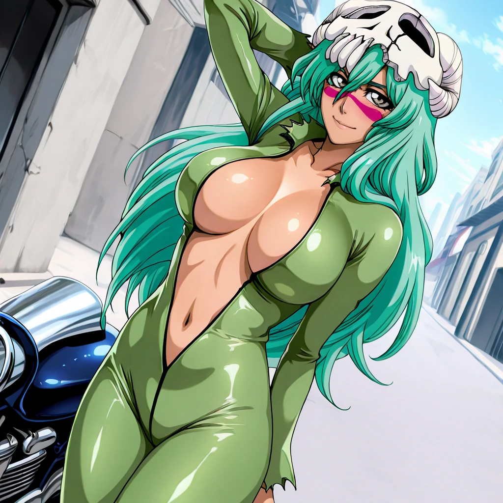 Trigger with dress: NelielBleachDress, 1girl, long hair, facial mark, retro artstyle, green hair, breasts, skull, belt