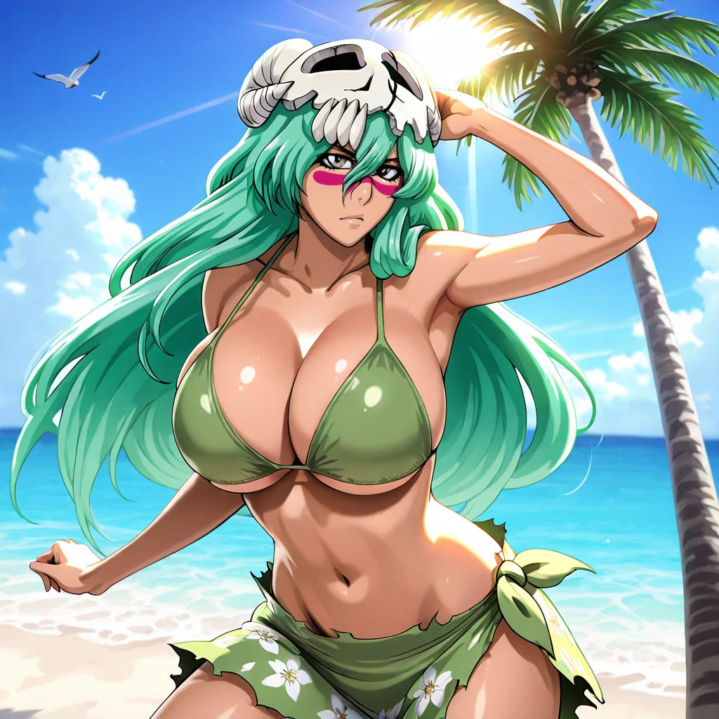 Trigger : NelielBleach, 1girl, long hair, facial mark, skull, skirt, green hair, large breasts, midriff
