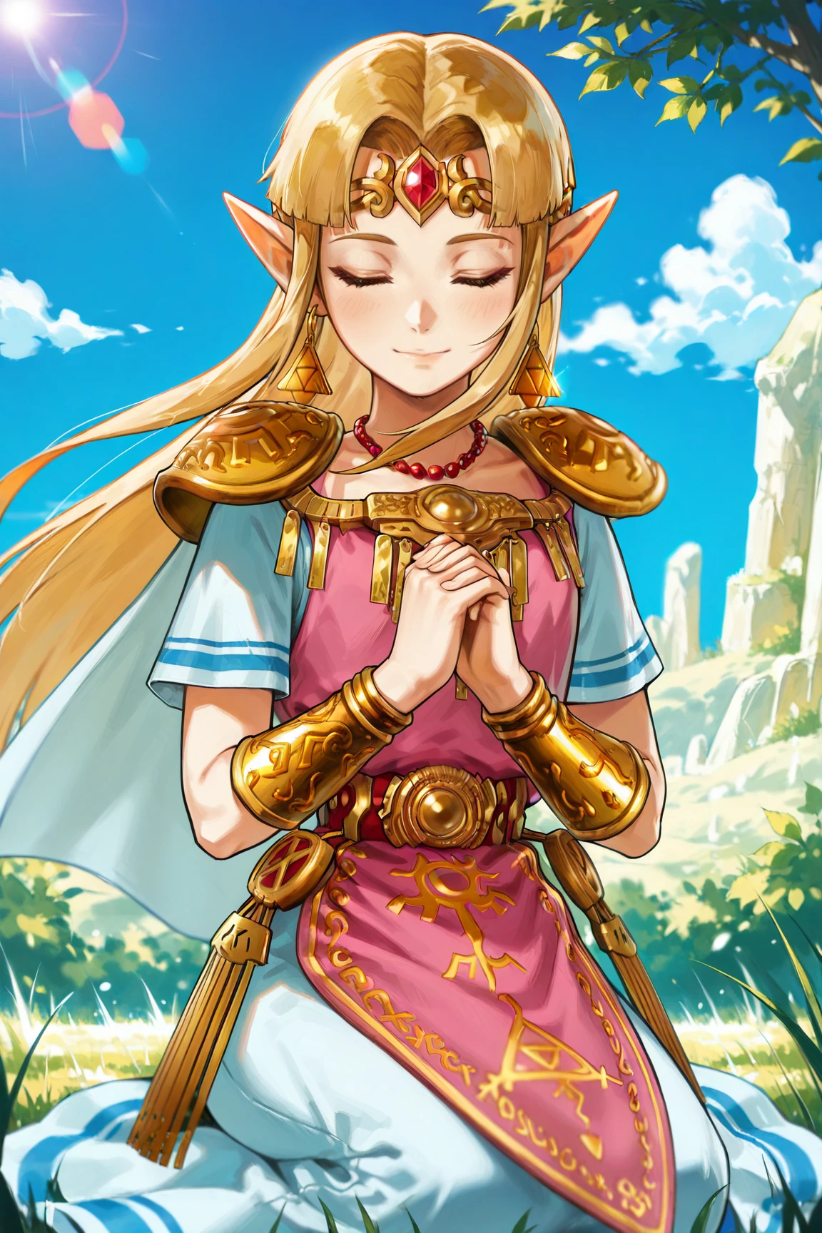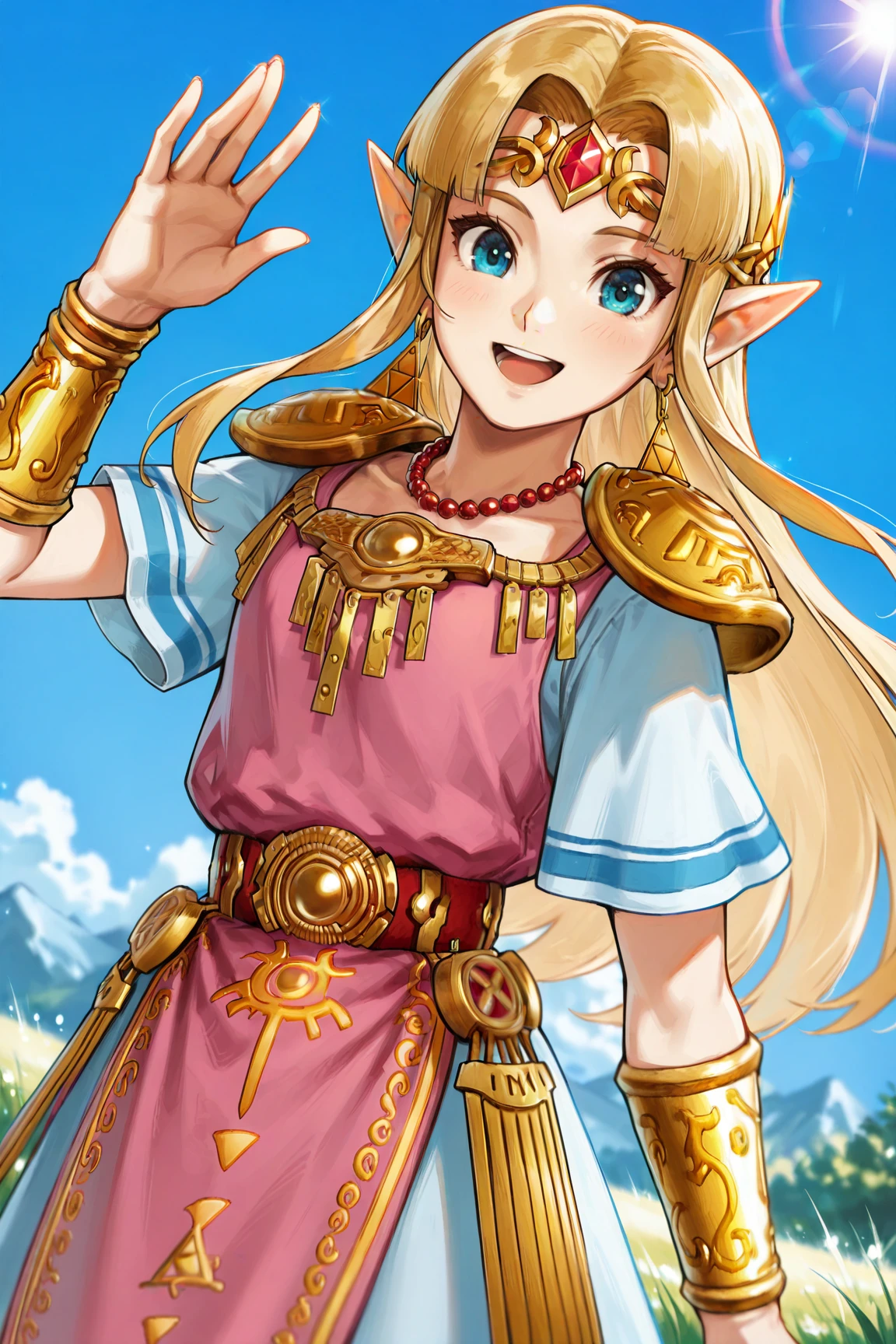 Default: omsz3lda_ssbu, 1girl, blonde hair, long hair, blue eyes, pointy ears, jewelry, dress, pink tabard, circlet, armor, triforce earrings, necklace, shoulder armor, tiara,
