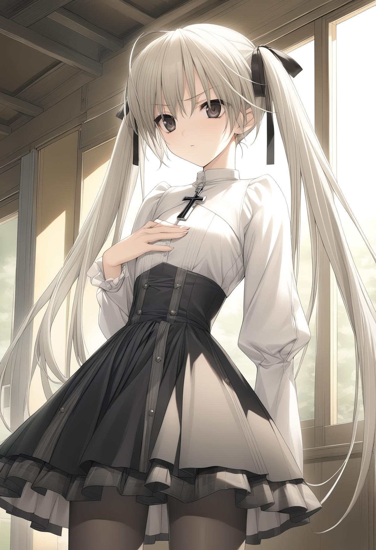 kasugano sora, long hair, twintails,hair ribbon,brown eyes, white hair,black eyes,