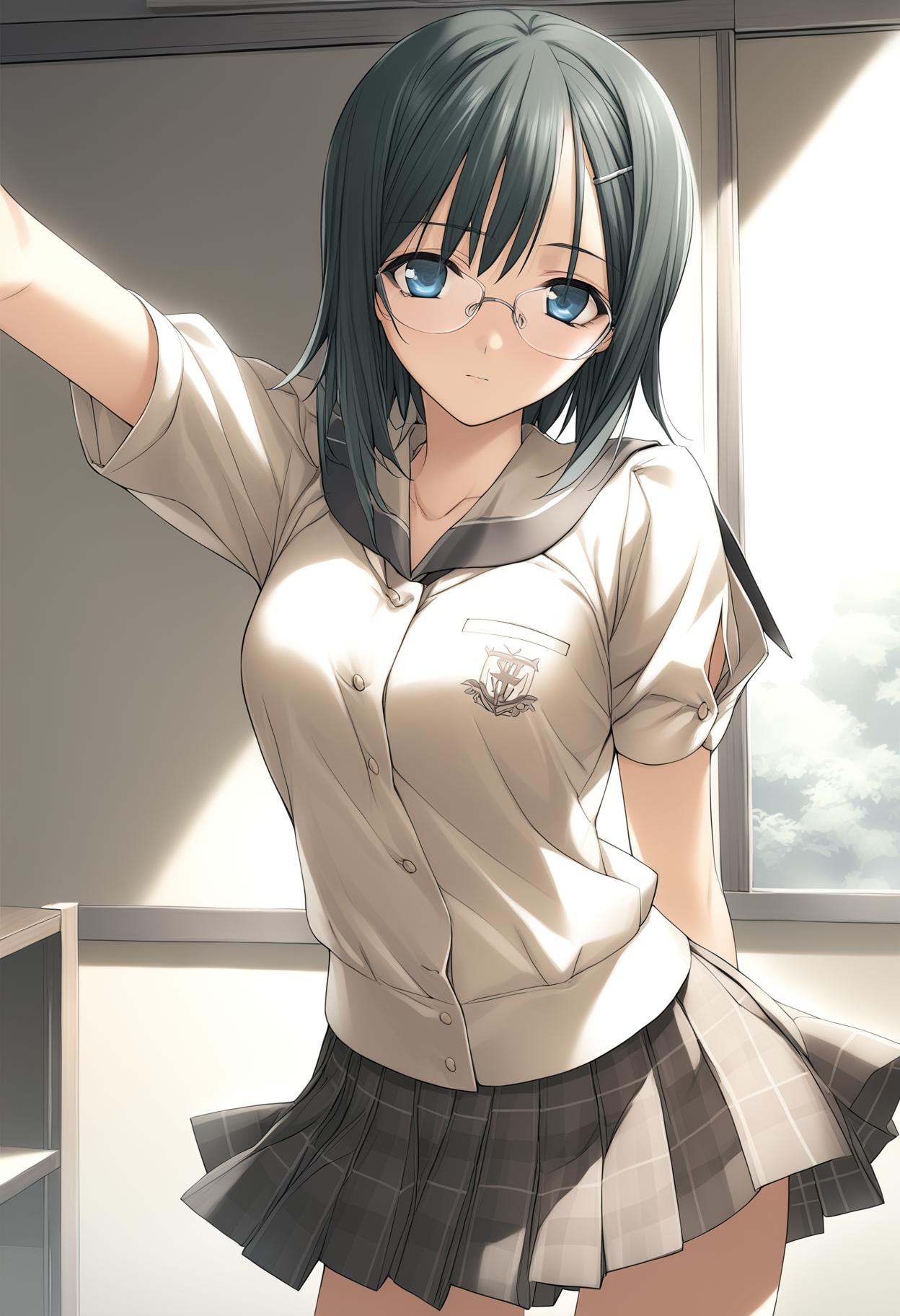 yorihime nao, glasses, short hair, black hair, blue eyes,