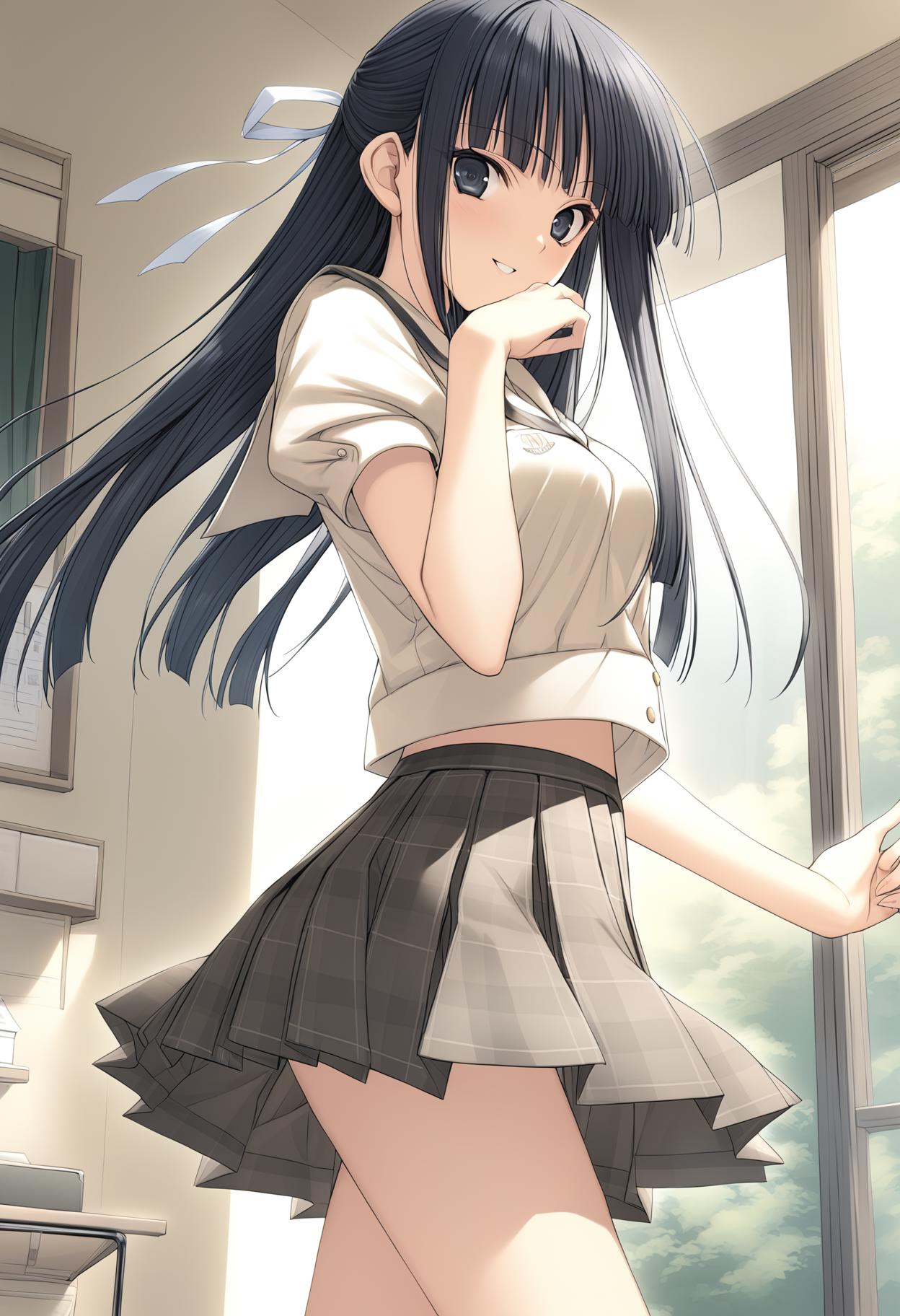 migiwa kazuha, long hair, black hair, hair ribbon, black eyes,