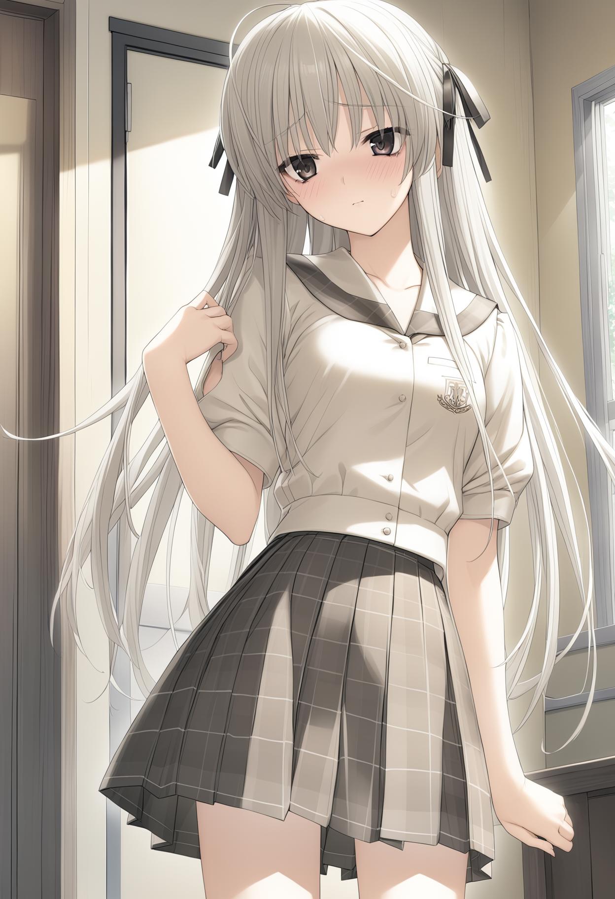 kasugano sora, long hair, straight hair,white hair ribbon,brown eyes, white hair,black eyes,