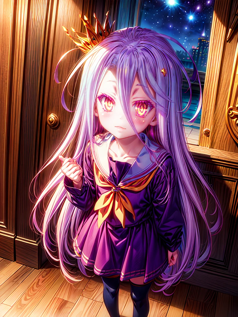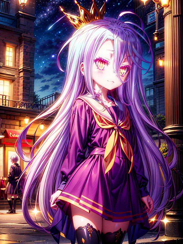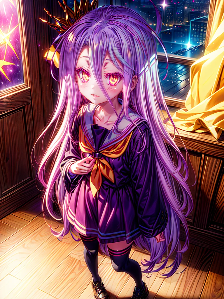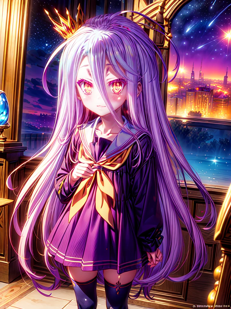 anime style,anime coloring,1girl,long hair,1girl,solo,school uniform,looking at viewer,serafuku,blue hair,very long hair,crown,blush,thighhighs,hair between eyes,yellow eyes,skirt,red eyes,neckerchief,sitting,shirt,sailor collar,long sleeves,closed mouth,black thighhighs,purple hair,yellow neckerchief,orange eyes,white sailor collar,simple background,blue thighhighs,zettai ryouiki,purple shirt,collarbone,purple skirt,smile,brown eyes,full body,standing,Starry City Background