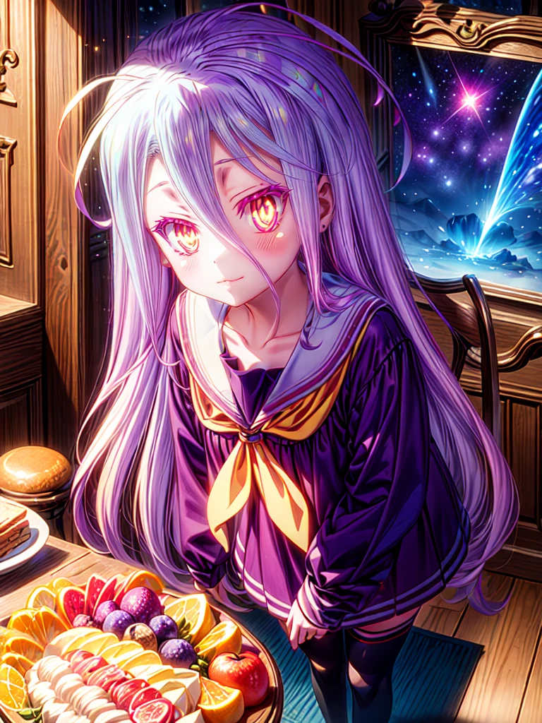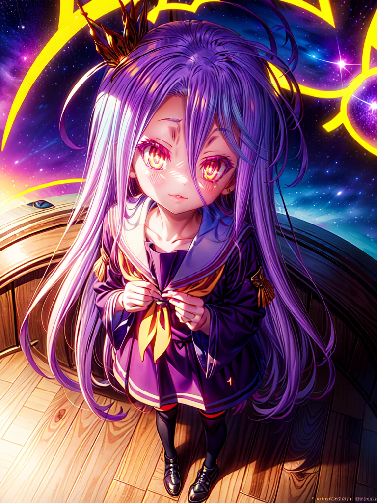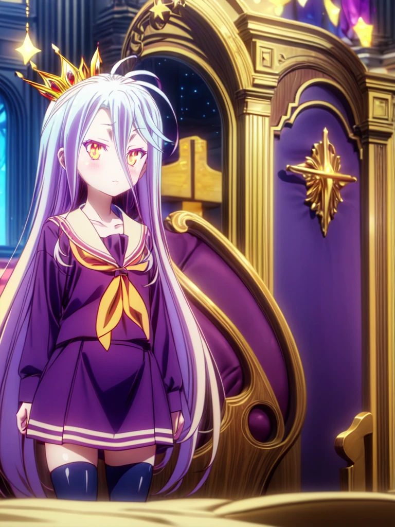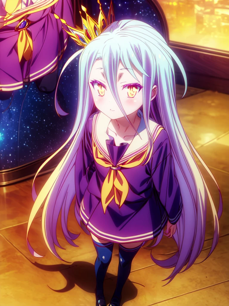anime style,anime coloring,1girl,long hair,1girl,solo,school uniform,looking at viewer,serafuku,blue hair,very long hair,crown,blush,thighhighs,hair between eyes,yellow eyes,skirt,red eyes,neckerchief,sitting,shirt,sailor collar,long sleeves,closed mouth,black thighhighs,purple hair,yellow neckerchief,orange eyes,white sailor collar,simple background,blue thighhighs,zettai ryouiki,purple shirt,collarbone,purple skirt,smile,brown eyes,full body,standing,Starry City Background