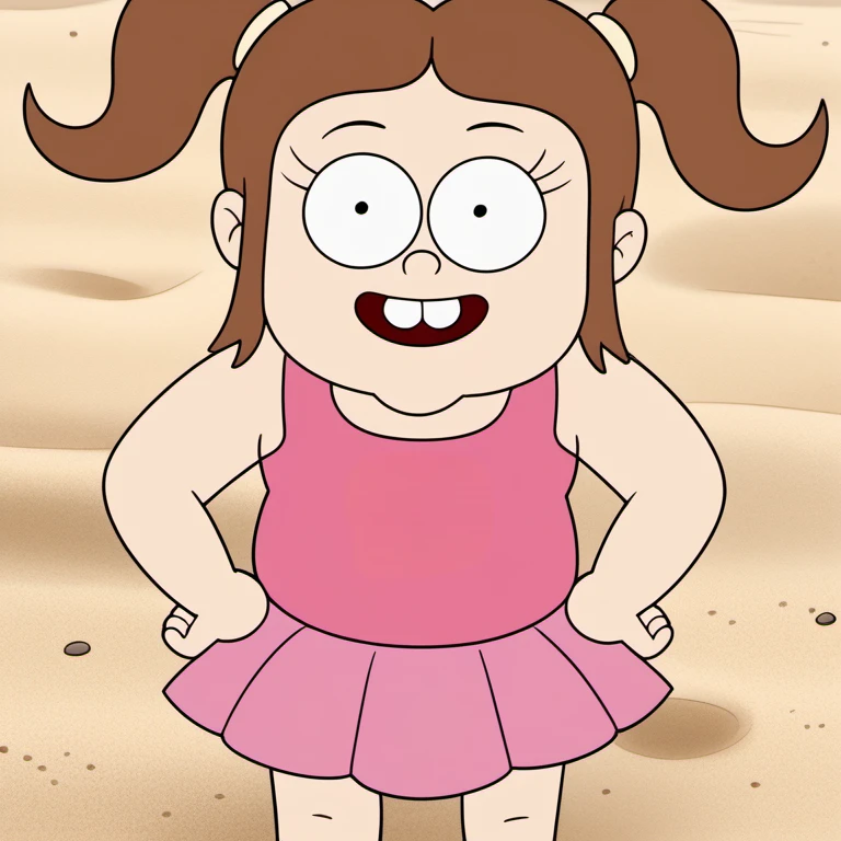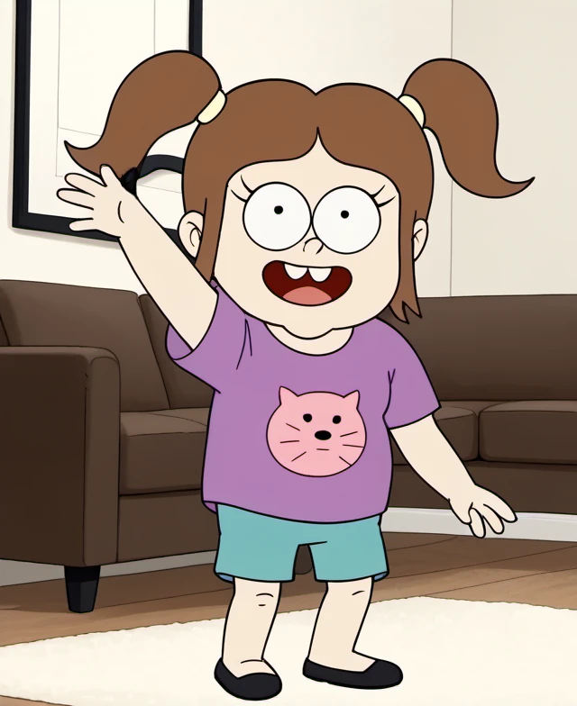 solo, 1girl, brown hair, shirt, shorts, open mouth, twintails, black footwear, purple shirt, short sleeves, animal print, t-shirt, buck teeth, child