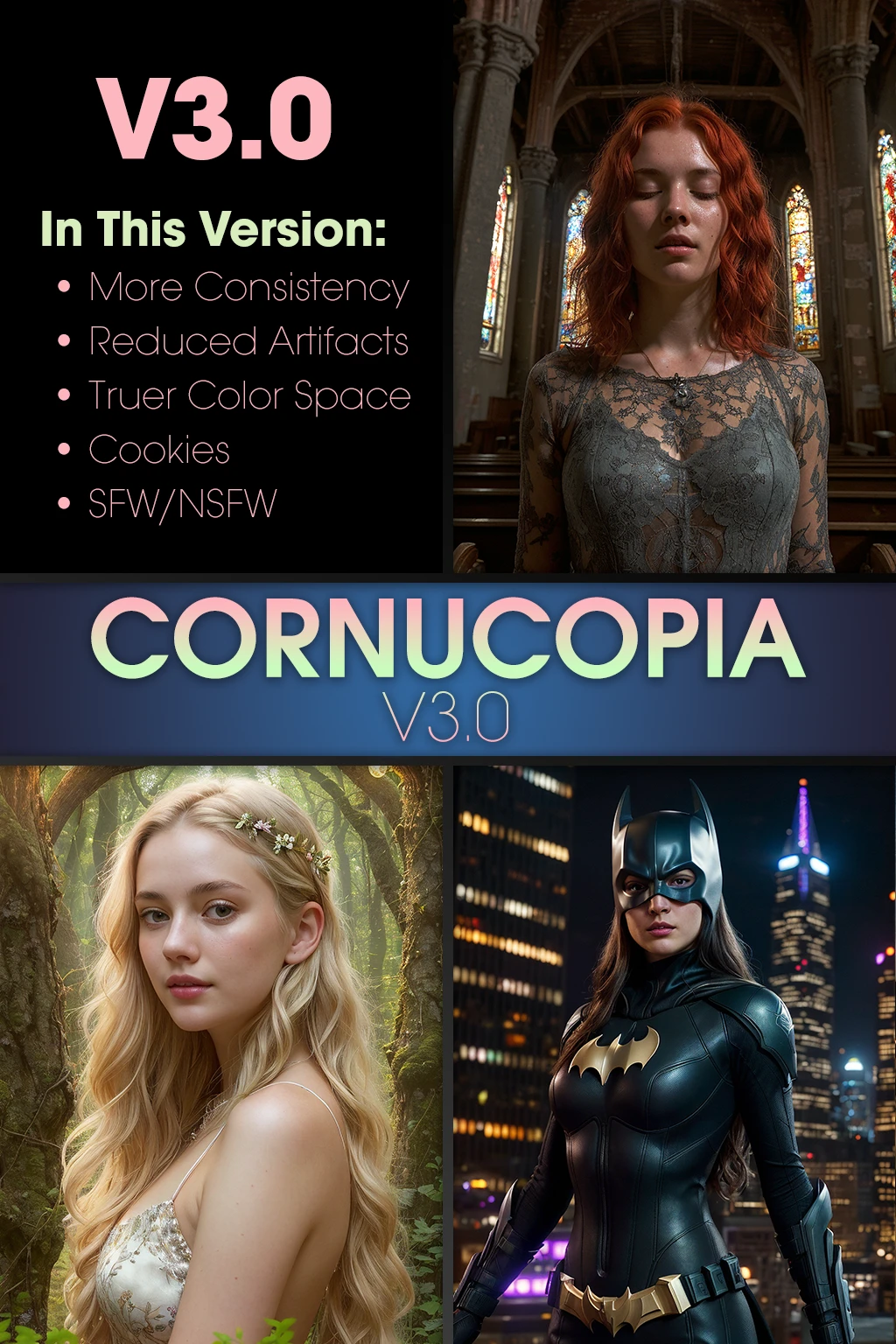 Cornucopia V3.0 is an incredibly versatile sfw/nsfw SD1.5 base model. This model does many things well with a high level of prompt adherence.