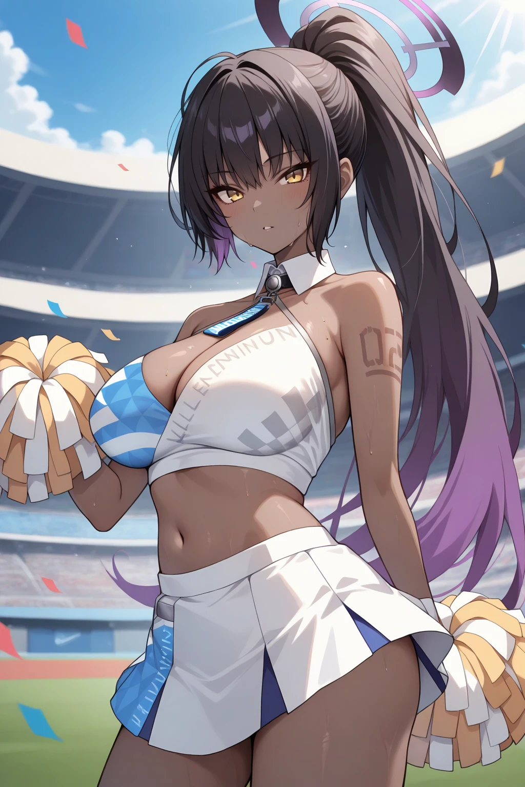 Outfit 4 : ponytail, cheerleader, detached collar, two-tone sports bra, blue sports bra, white sports bra, halterneck, cleavage, bare shoulders, midriff, two-tone skirt, blue skirt, white skirt