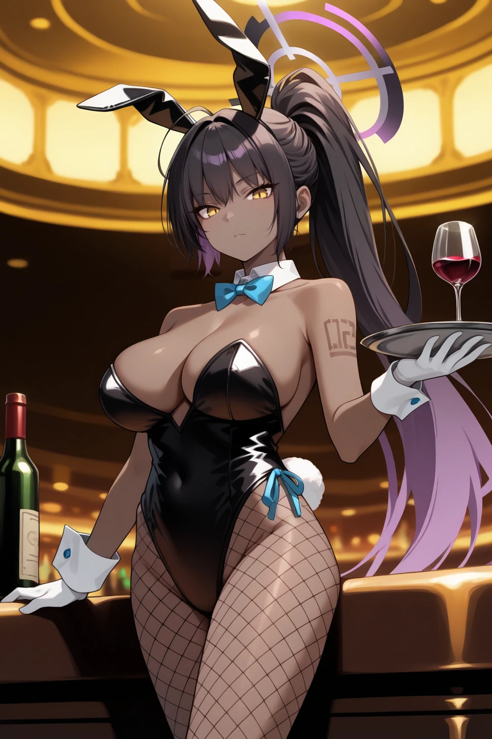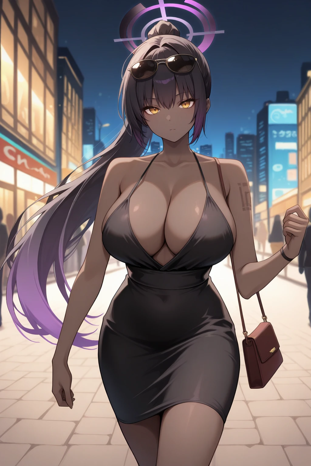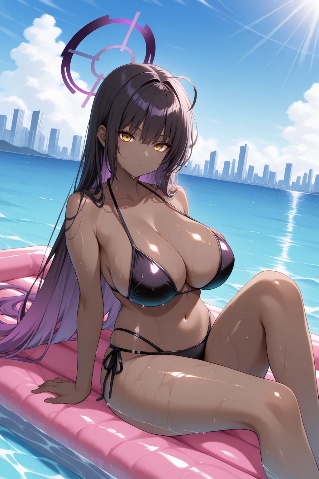 Appearance : kar1n, tsurime, purple halo, dark-skinned female, large breasts, gradient hair, black hair, purple hair, very long hair, yellow eyes
