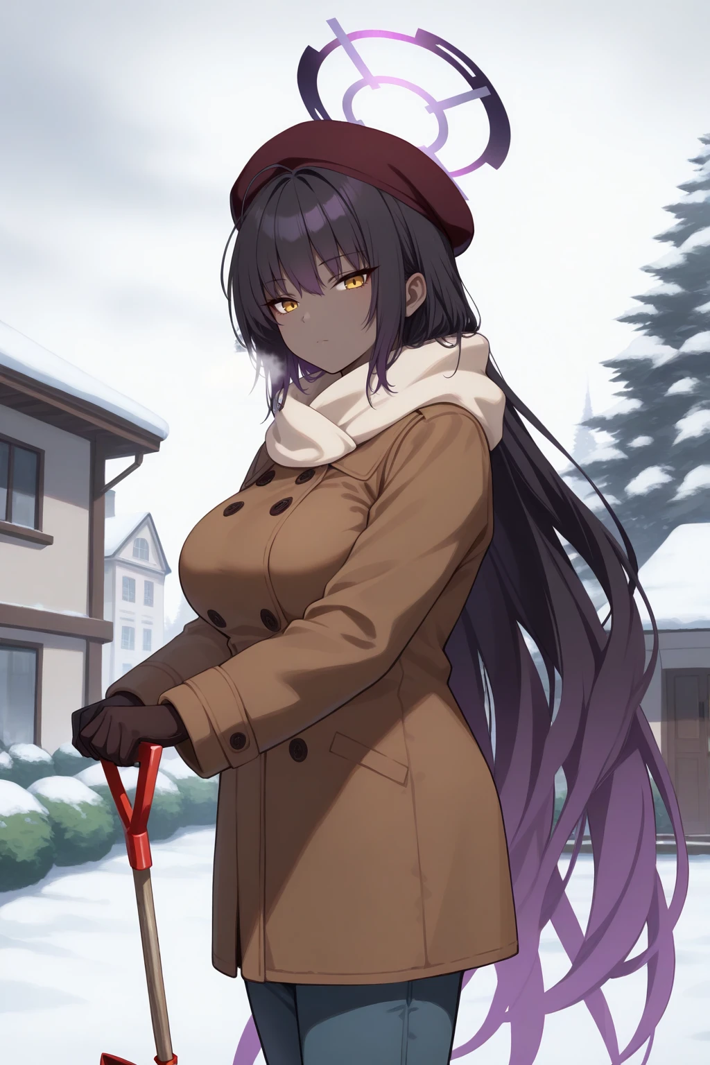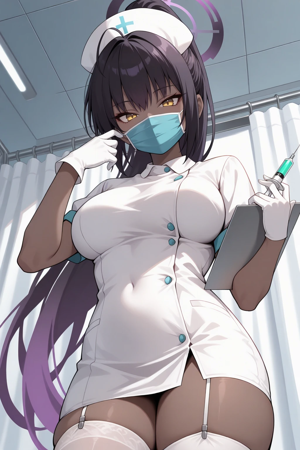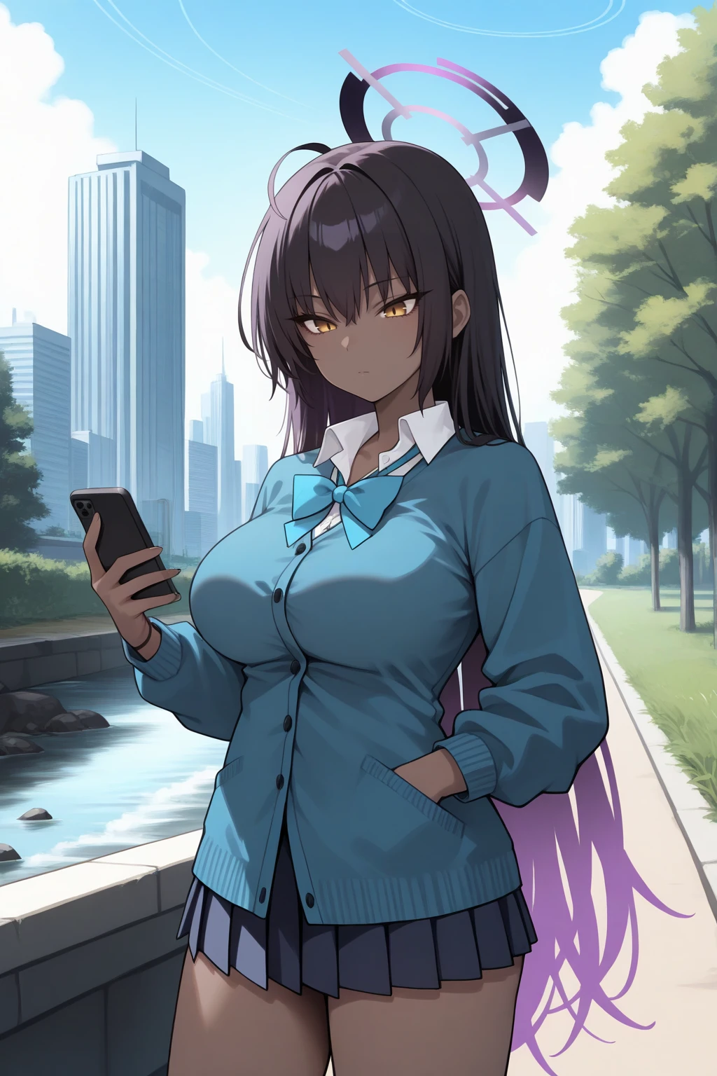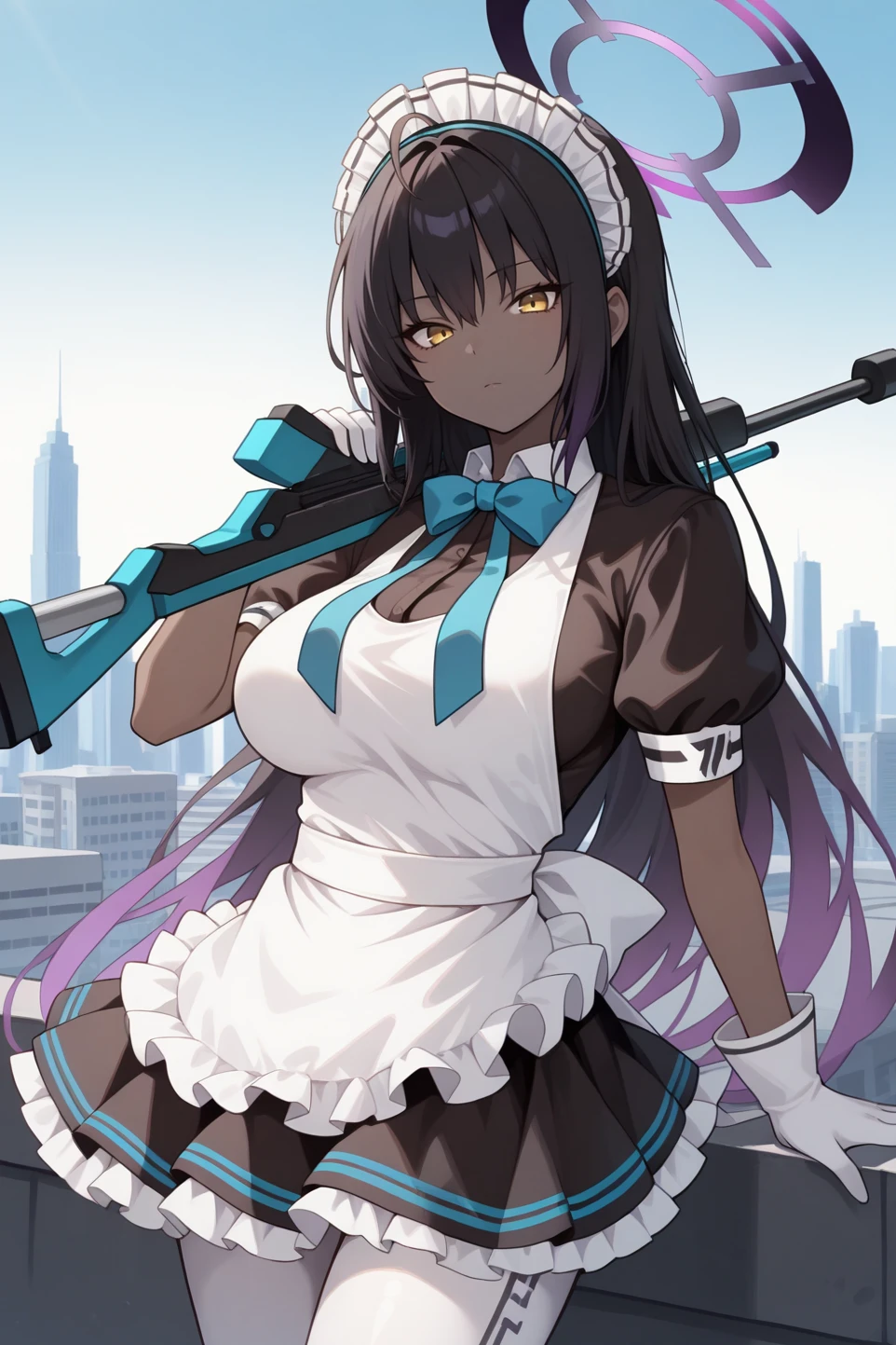 Appearance : kar1n, tsurime, purple halo, dark-skinned female, large breasts, gradient hair, black hair, purple hair, very long hair, yellow eyes