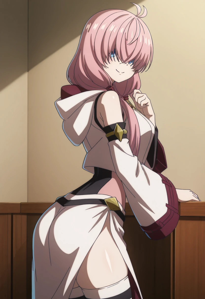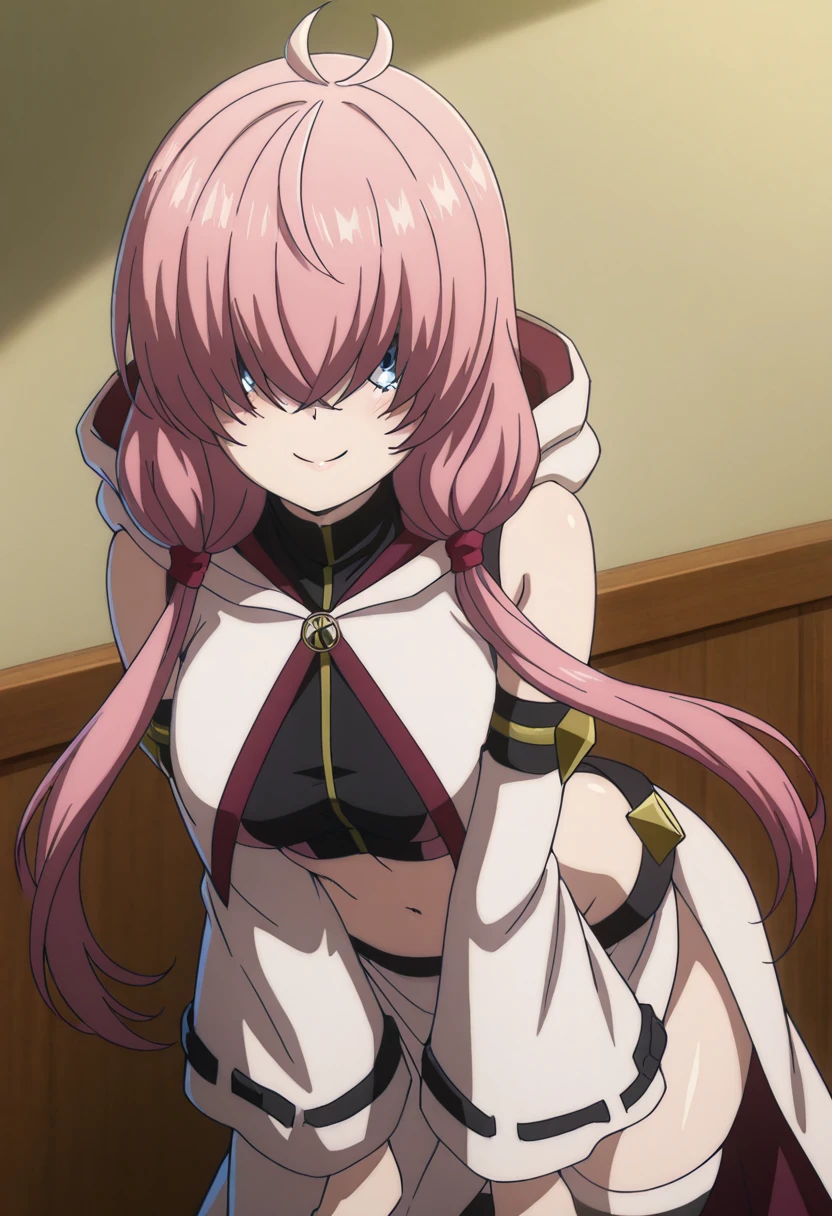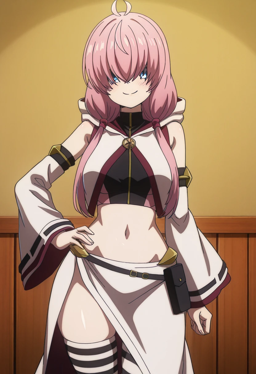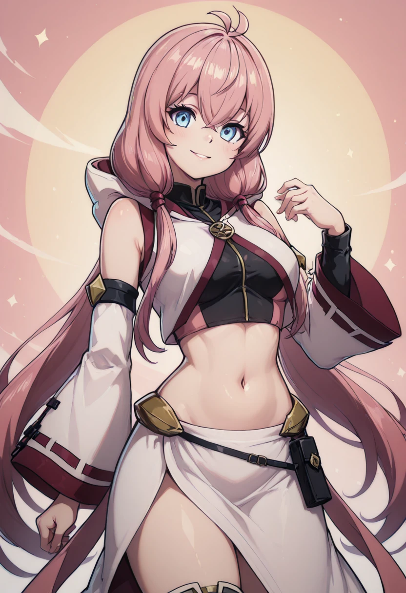zzAlichey, pink hair, long hair, low twintails, blue eyes, ahoge, antenna hair, crop top, detached sleeves, hood down, long sleeves, wide sleeves, striped thighhighs, side slit, hair over eyes, covered eyes,