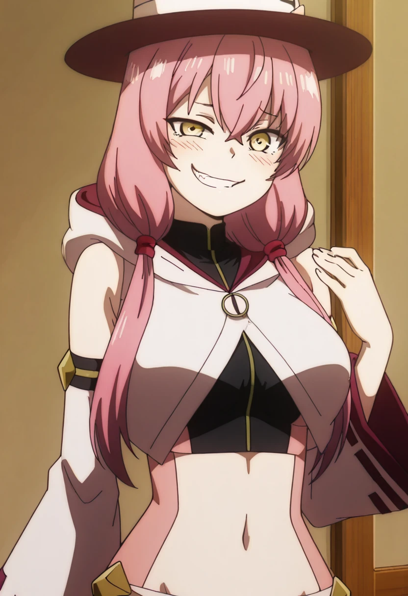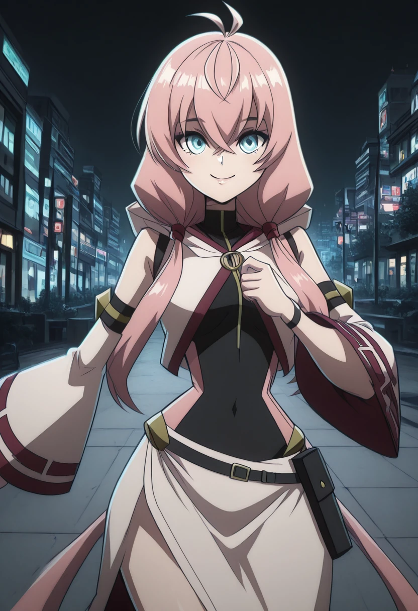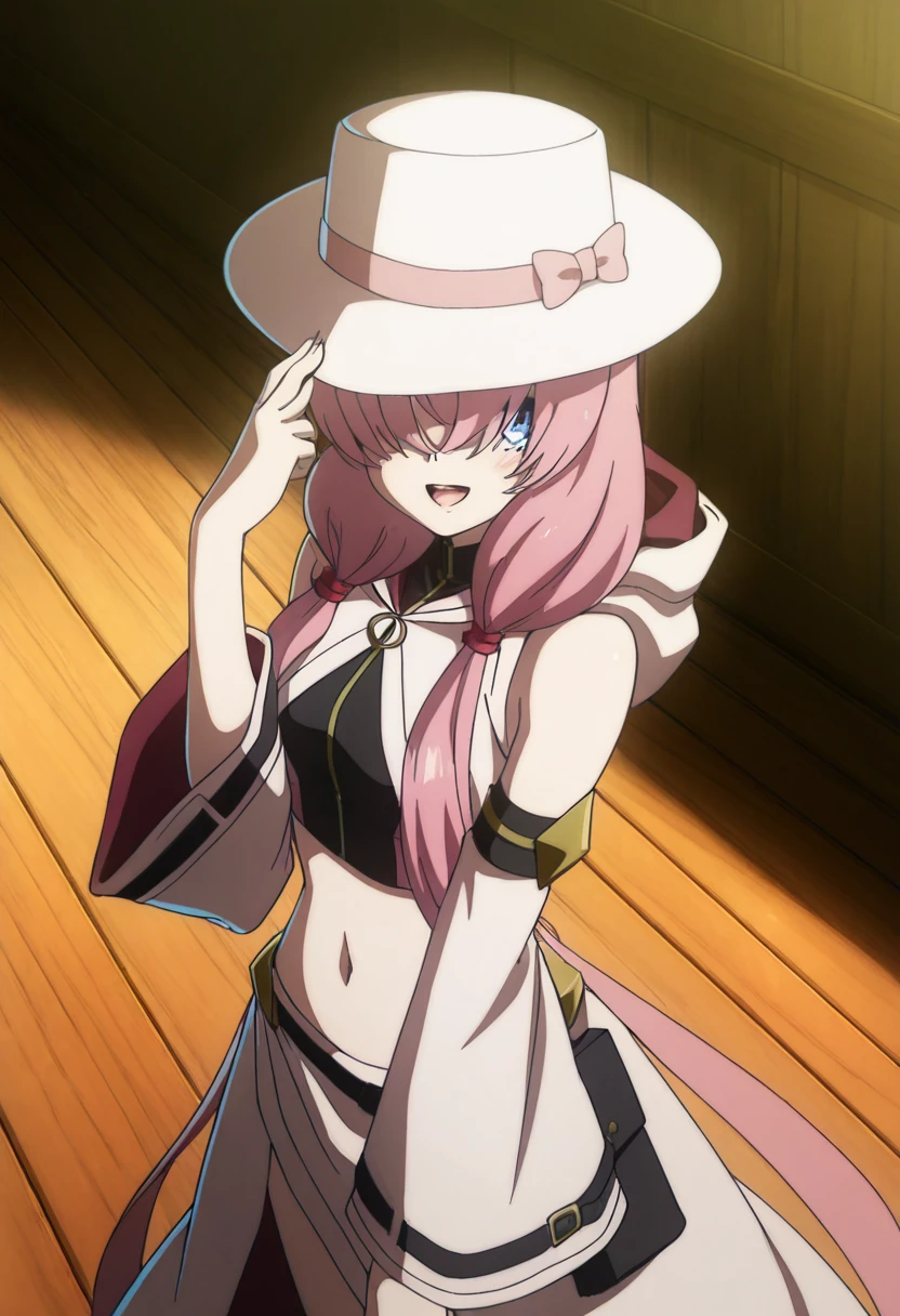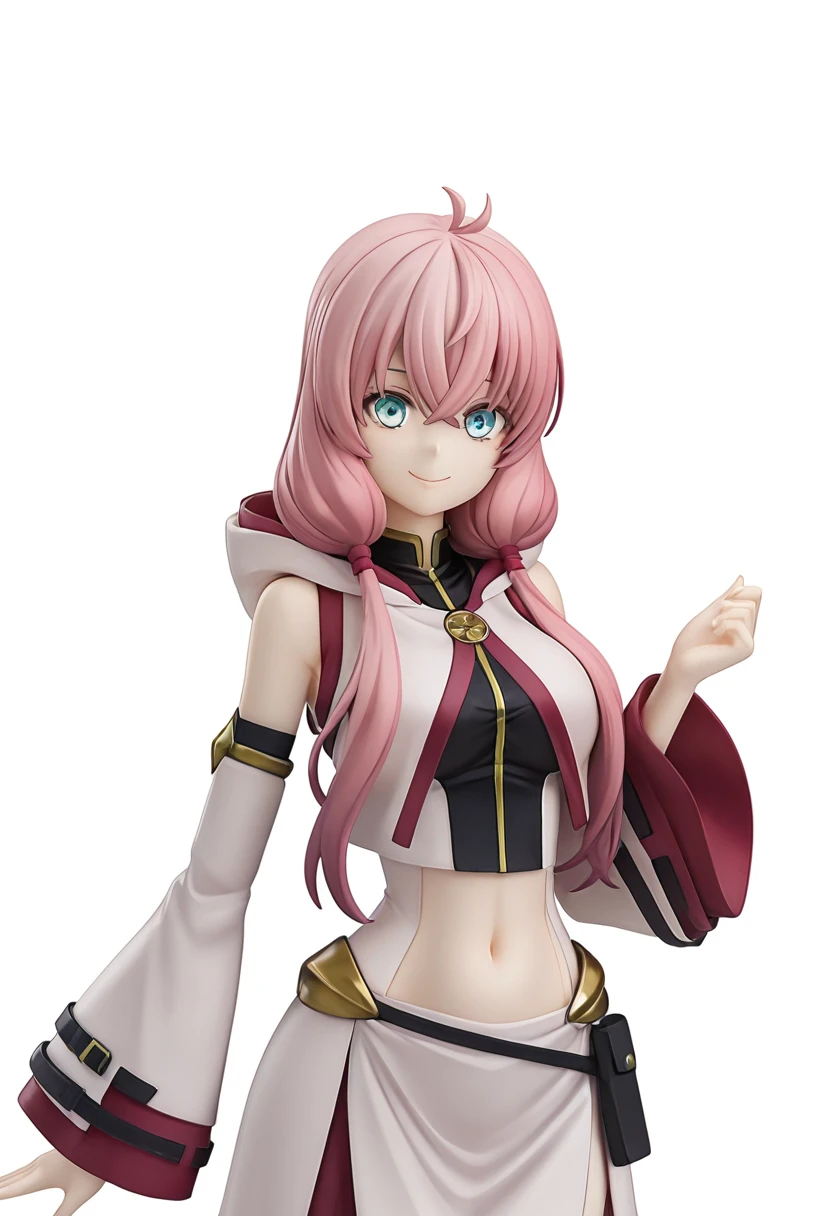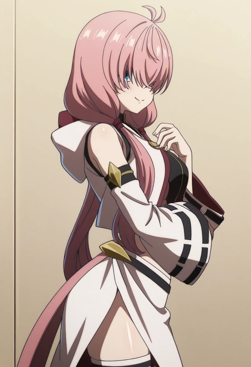 zzAlichey, pink hair, long hair, low twintails, blue eyes, ahoge, antenna hair, crop top, detached sleeves, hood down, long sleeves, wide sleeves, striped thighhighs, side slit, hair over eyes, covered eyes,