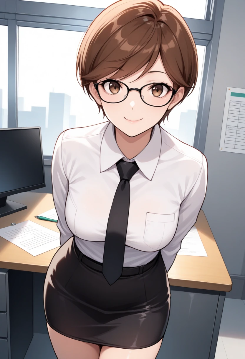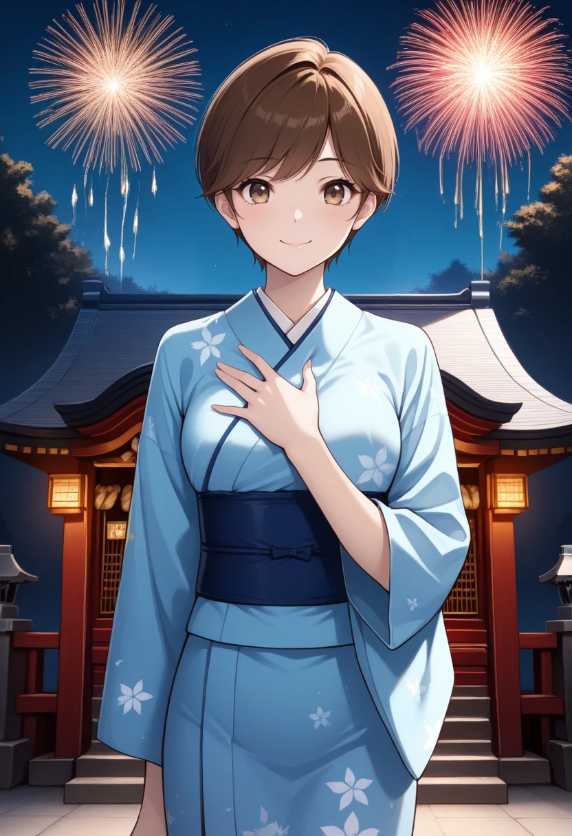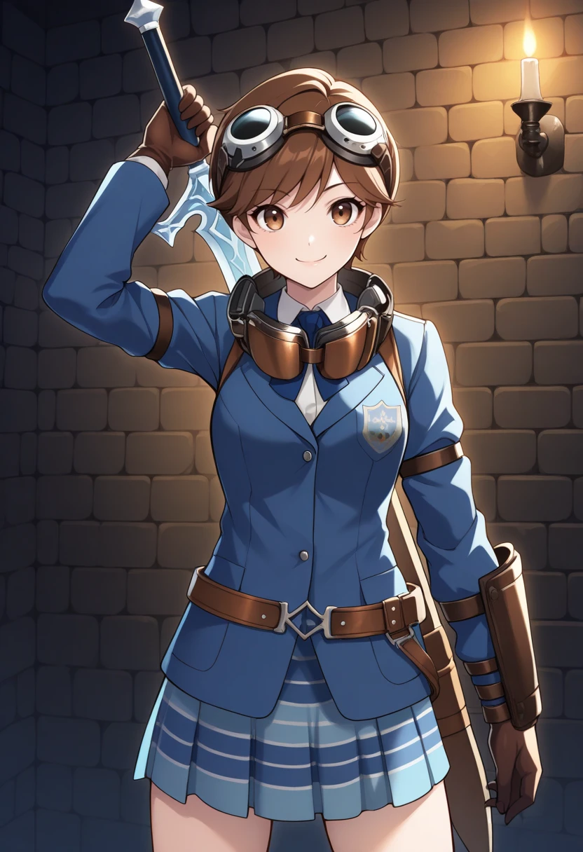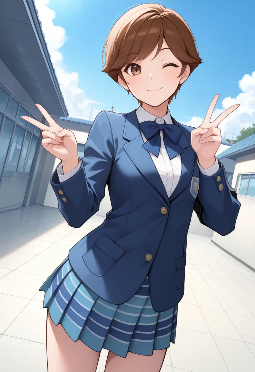 t4mak1smtif, brown hair, short hair, brown eyes, blue jacket, blue skirt,
