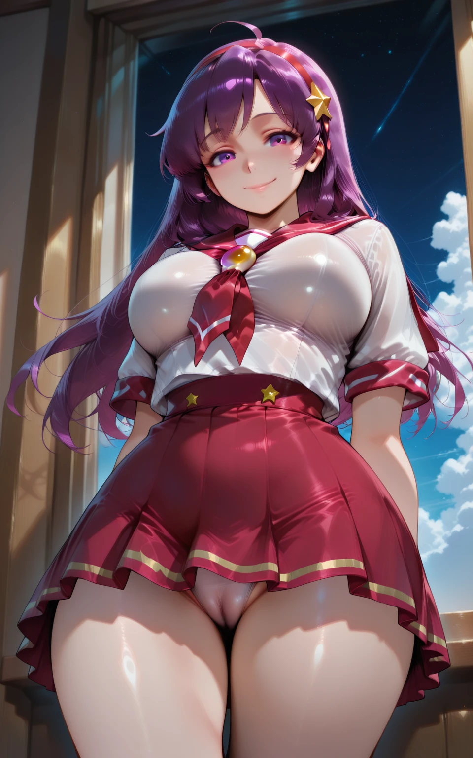 ilasamiyaathena, asamiya athena ??? with blanka, 1girl, breasts, hetero, ???????, purple hair, green skin, ?????????, skirt, long hair, large breasts, school uniform, hairband, serafuku, blush, interspecies, star hair ornament, star \(symbol\), colored skin, sailor collar, uncensored, purple eyes, clothes lift, short sleeves, thighs, hair ornament, <lora:illustrious- Asamiya Athena & Blanka -1024x1600:1>, cowgirl style, ???? in ?????, blanka, green ????, open mouth, ???, squatting, yelling, large ass, from back,