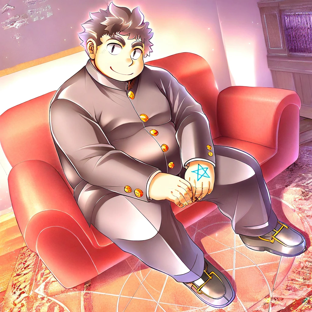mc5, 1boy, solo, male focus, short hair, spiky hair, dark brown hair, messy hair, chubby face, round cheeks, soft jawline, wide eyes, dark eyebrows, black eyes, chubby