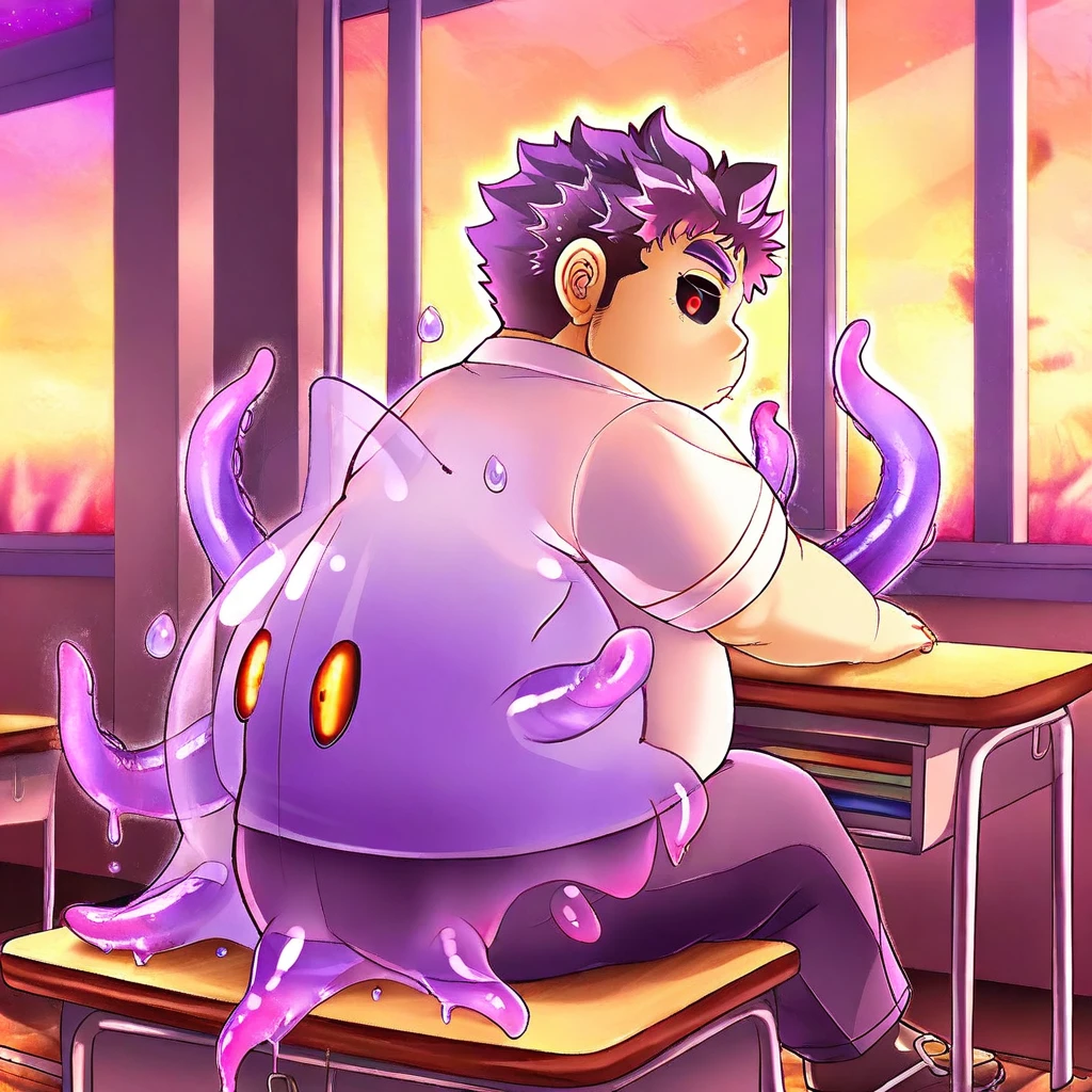 future-hero, cthulhu, 1boy, solo, male focus, short hair, spiky hair, dark brown hair,purple hair, two-tone hair, messy hair, chubby face, round cheeks, soft jawline, wide eyes, dark eyebrows, black sclera, red iris, purple goo clothing, spiky purple tentacles, purple aura