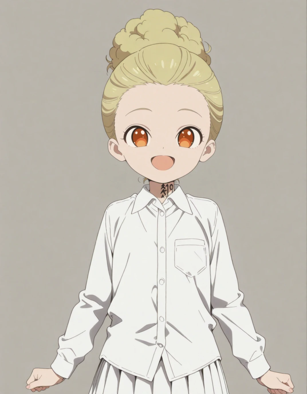 Alicia, blonde hair, hair pulled back, tied hair, hair bun, orange eyes