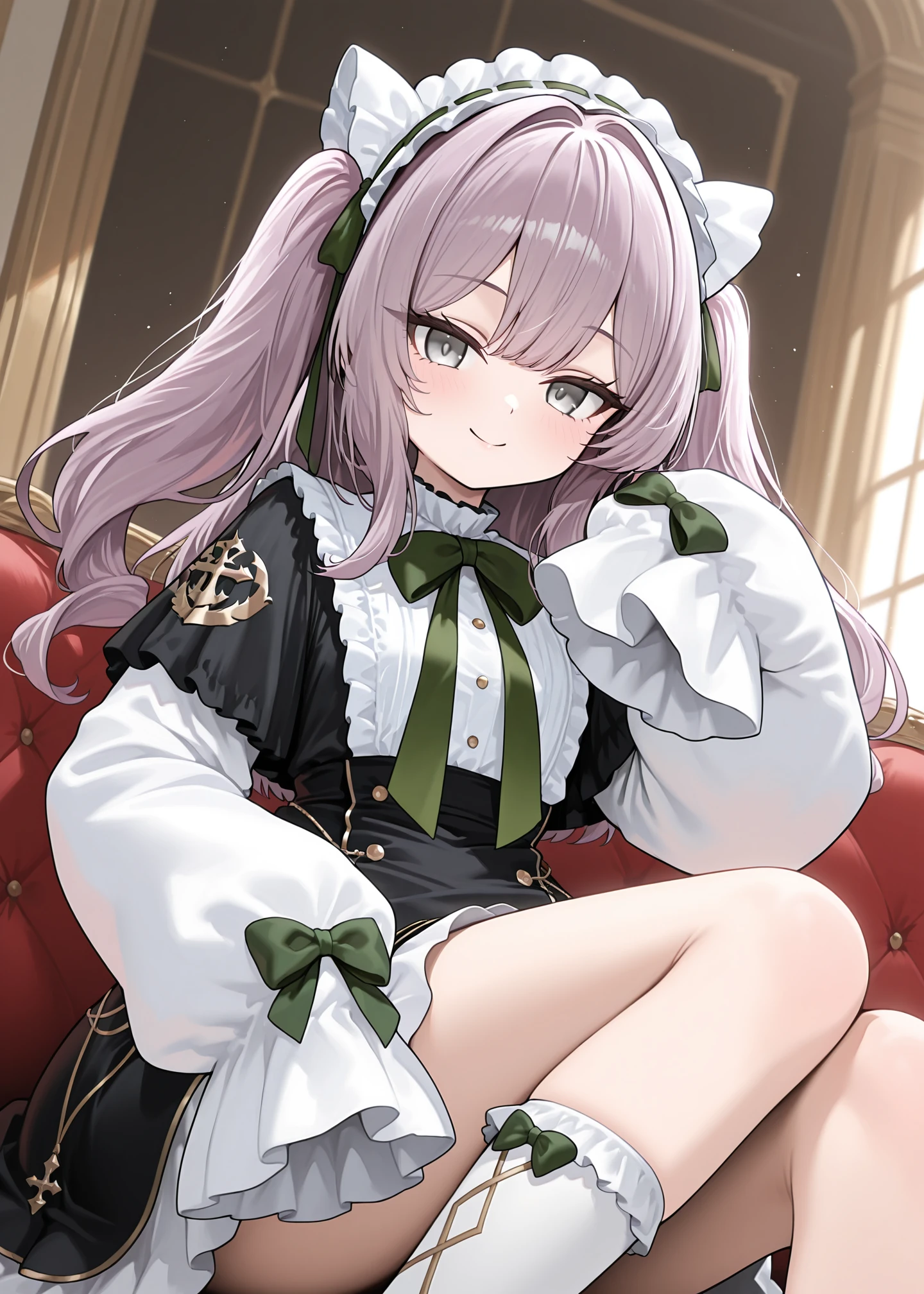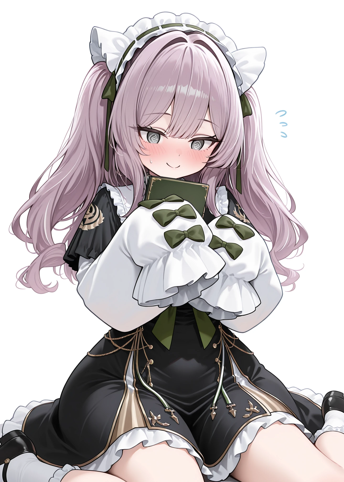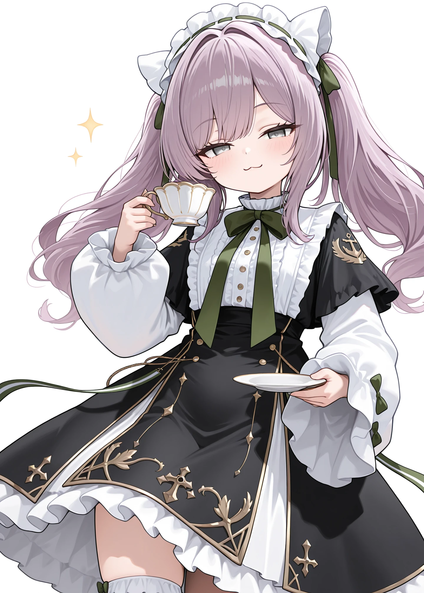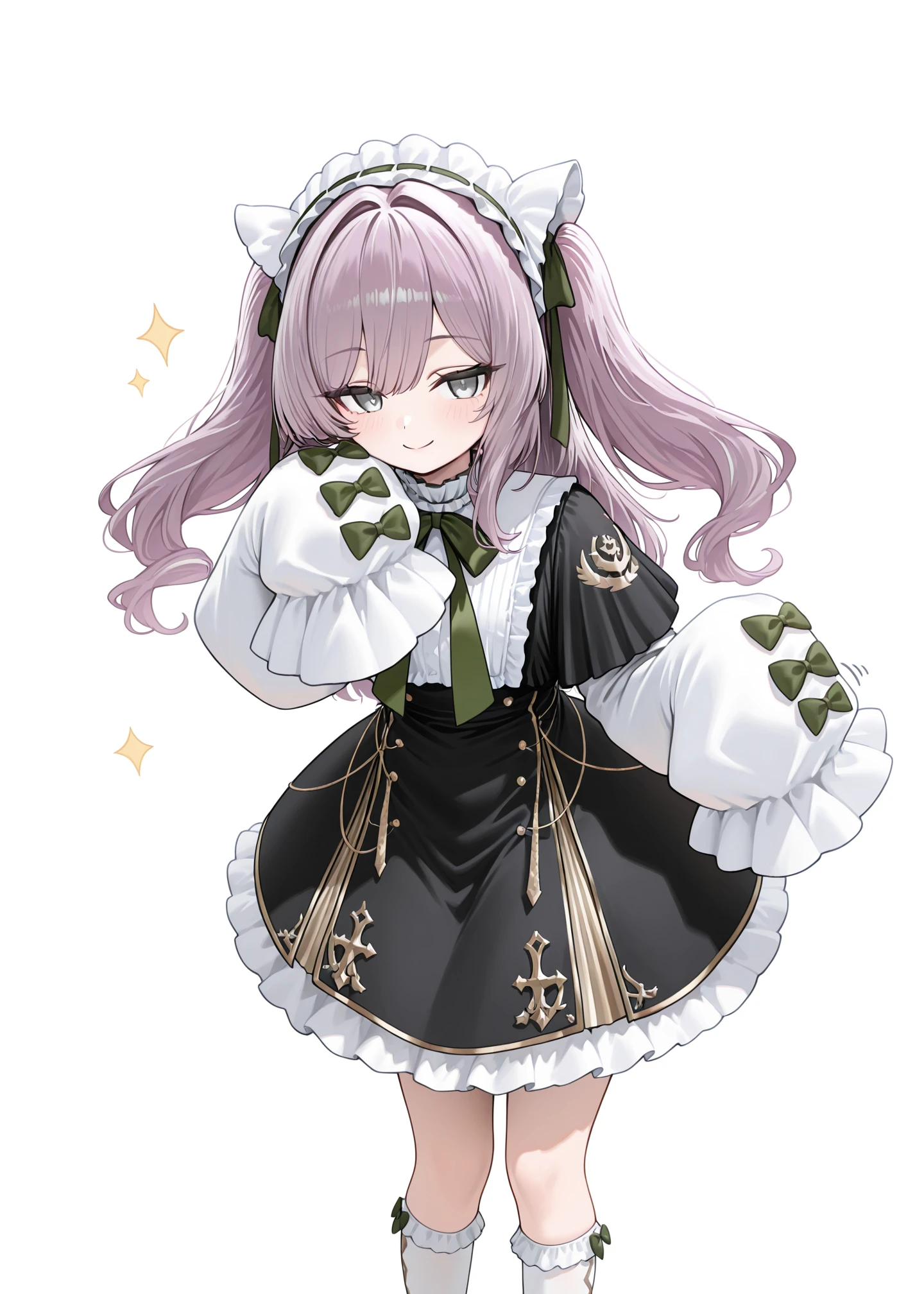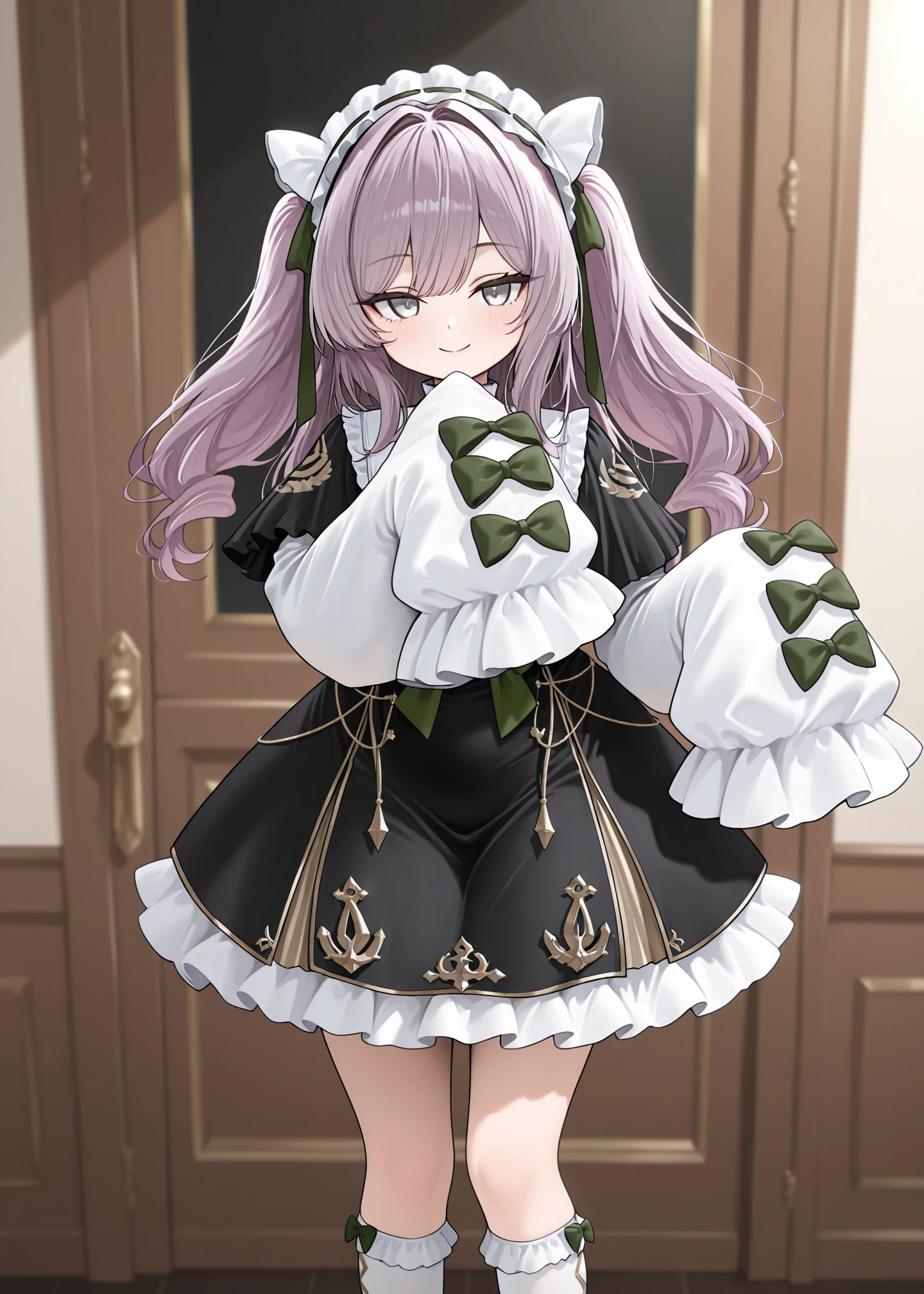 1girl,solo,vittorio_cuniberti_(azur_lane),white maid headdress, black dress, puffy long sleeves , long_hair, bangs, twintails,white sleeves, purple hair, frills socks, black_footwear, grey_eyes,black capelet, , white_socks, green_bows,wide sleeves,