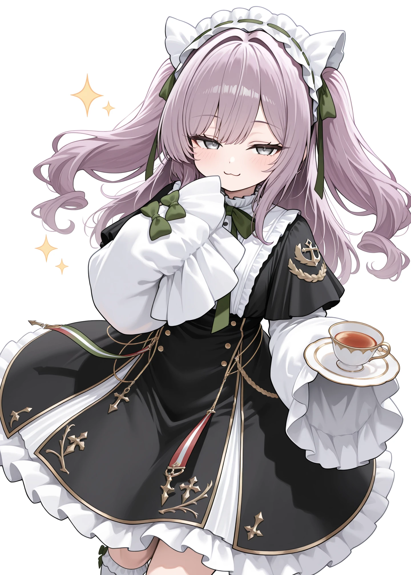 vittorio_cuniberti_(azur_lane),white maid headdress, black dress, puffy long sleeves , long_hair, bangs, twintails,white sleeves, purple hair, frills socks, black_footwear, grey_eyes,black capelet, , white_socks, green_bow,wide sleeves