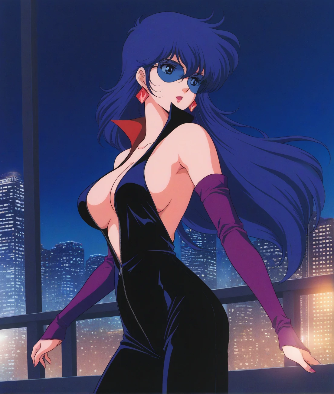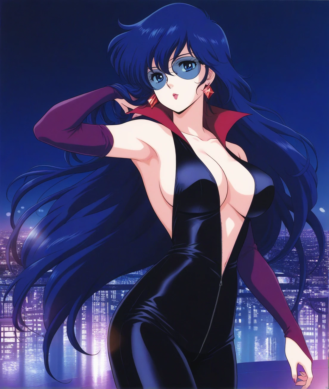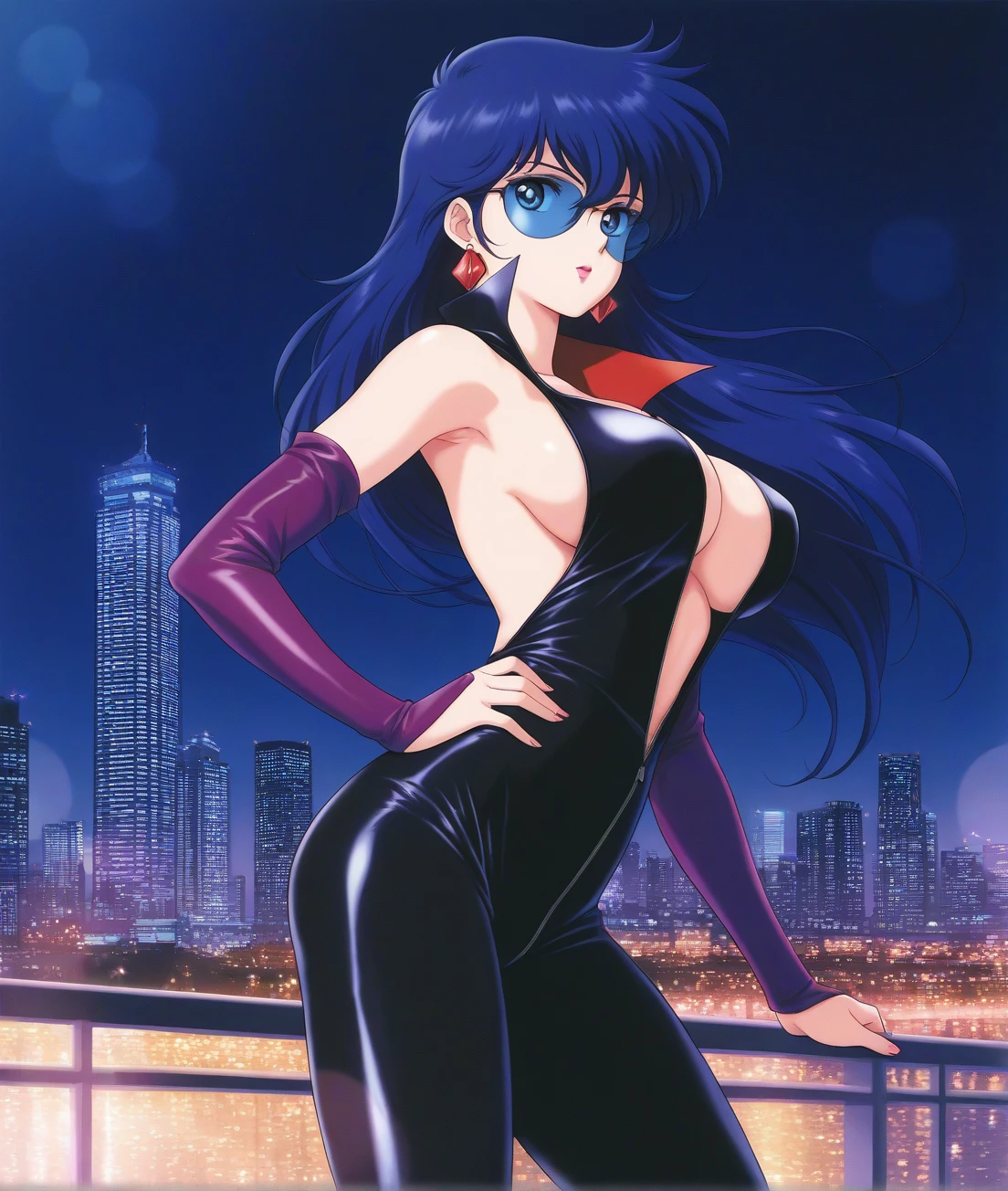 sheila, blue hair, long hair, red earrings, blue sunglasses, large breasts, bare shoulder, heels, black bodysuit, purple wedding gauntlet, armpit, saggy breasts, ,outdoor,(night city:1.5),watercolor,(no choker),inomata_mutsumi_(style),