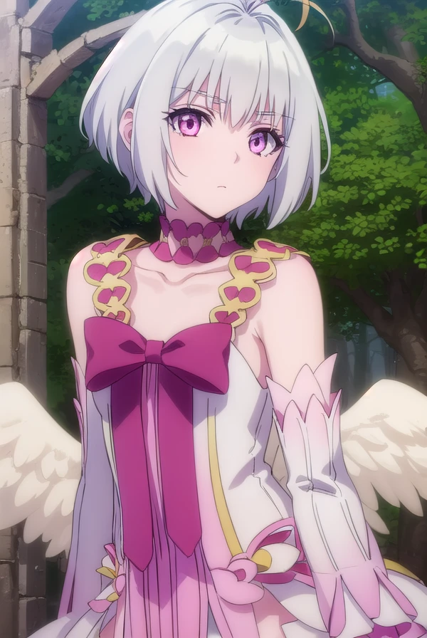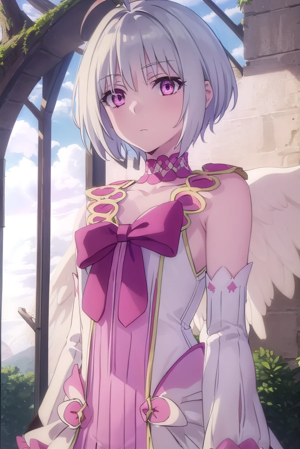 dress, bow, detached sleeves, wings, choker, feathered wings, angel wings, frills, pink bow,