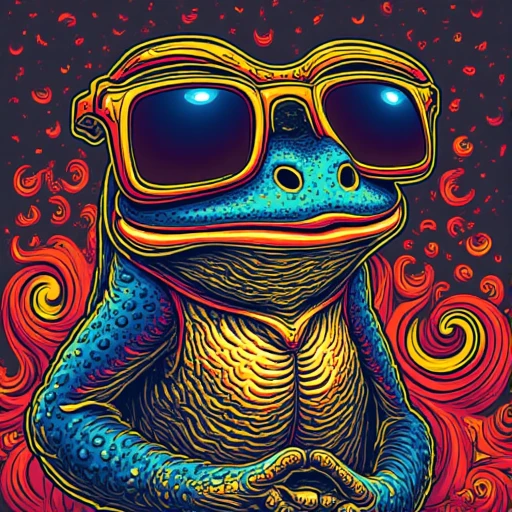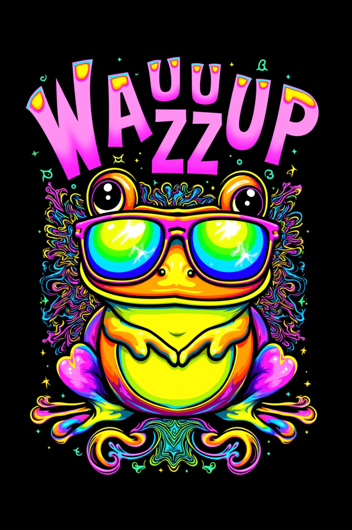 A graphic t-shirt design of a psychedelic colored tree frog wearing mirrored sunglasses that reads 'Wazzup'