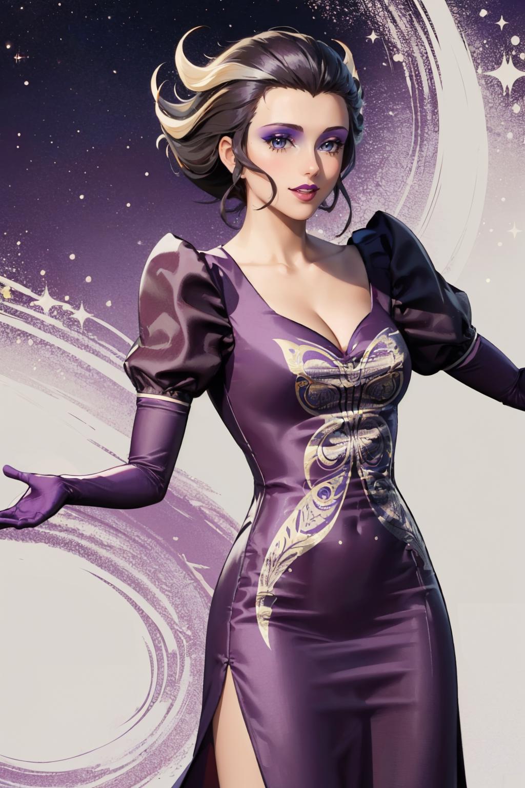 belladonnapersona, purple dress, makeup, lipstick, cleavage, elbow gloves, puffy sleeves, black hair, white hair, two-tone hair