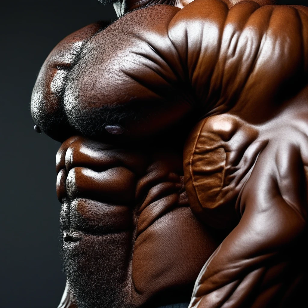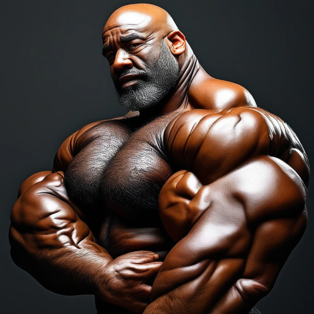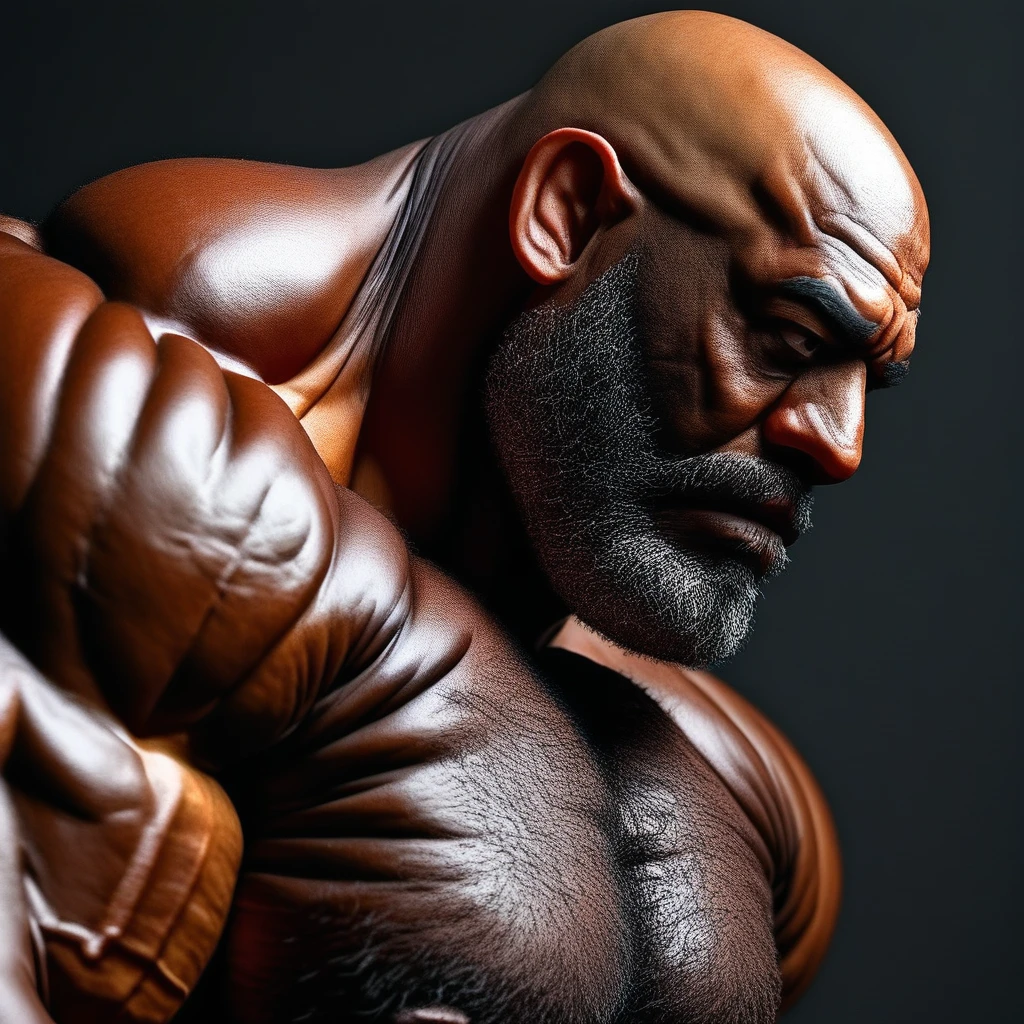 Photo-realistic, 65-year-old Black male, mixed descent, bald, beard, body hairs, very muscular