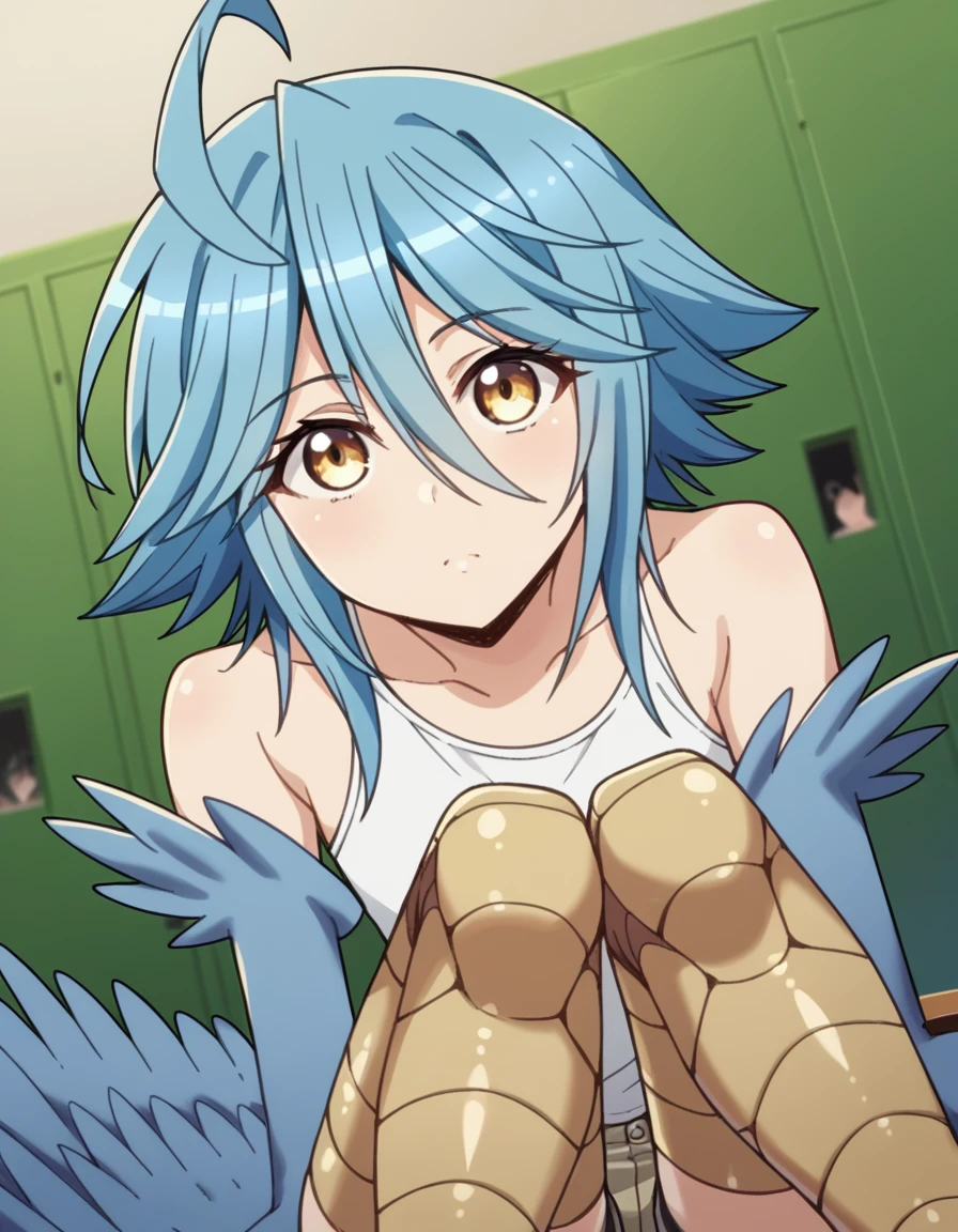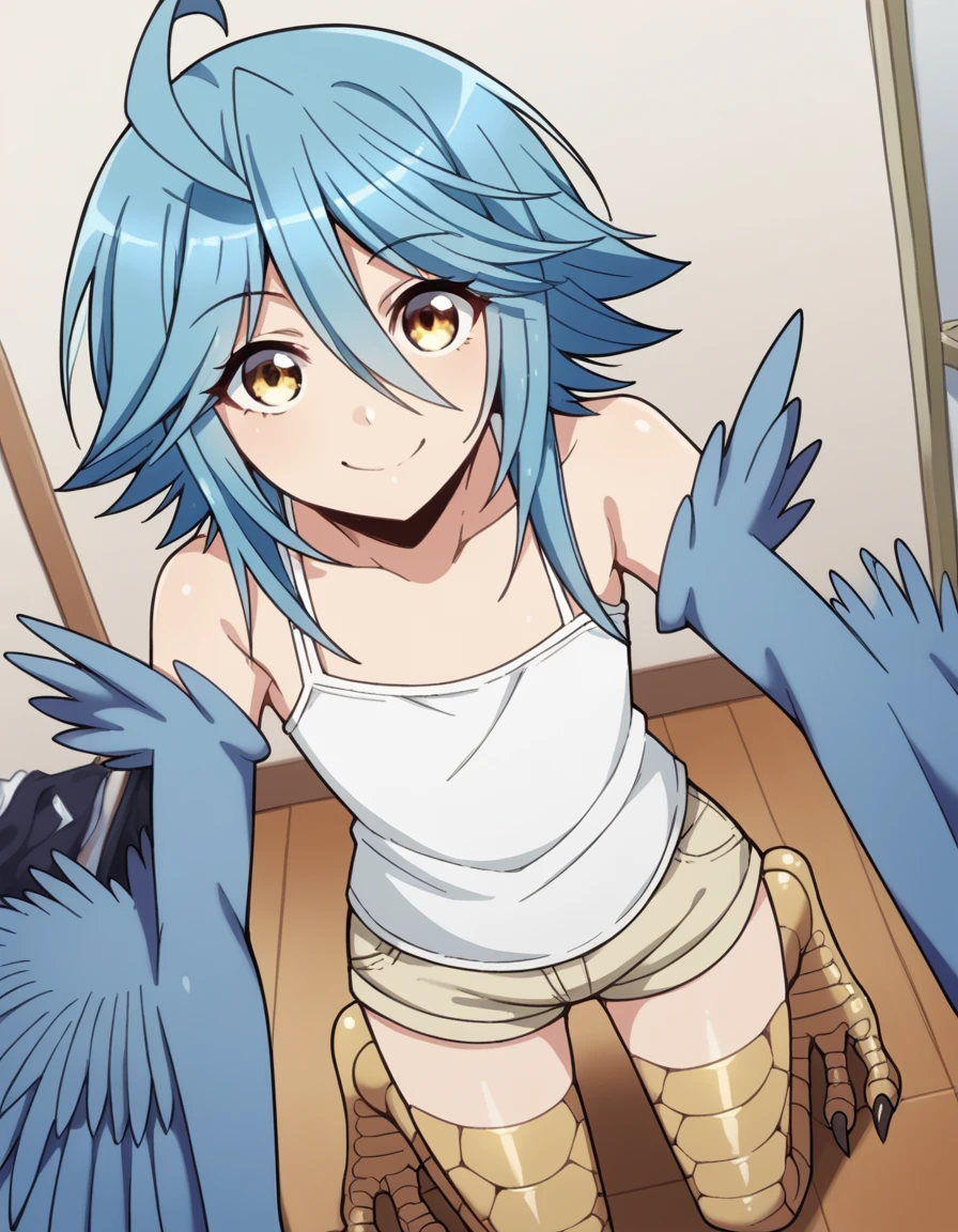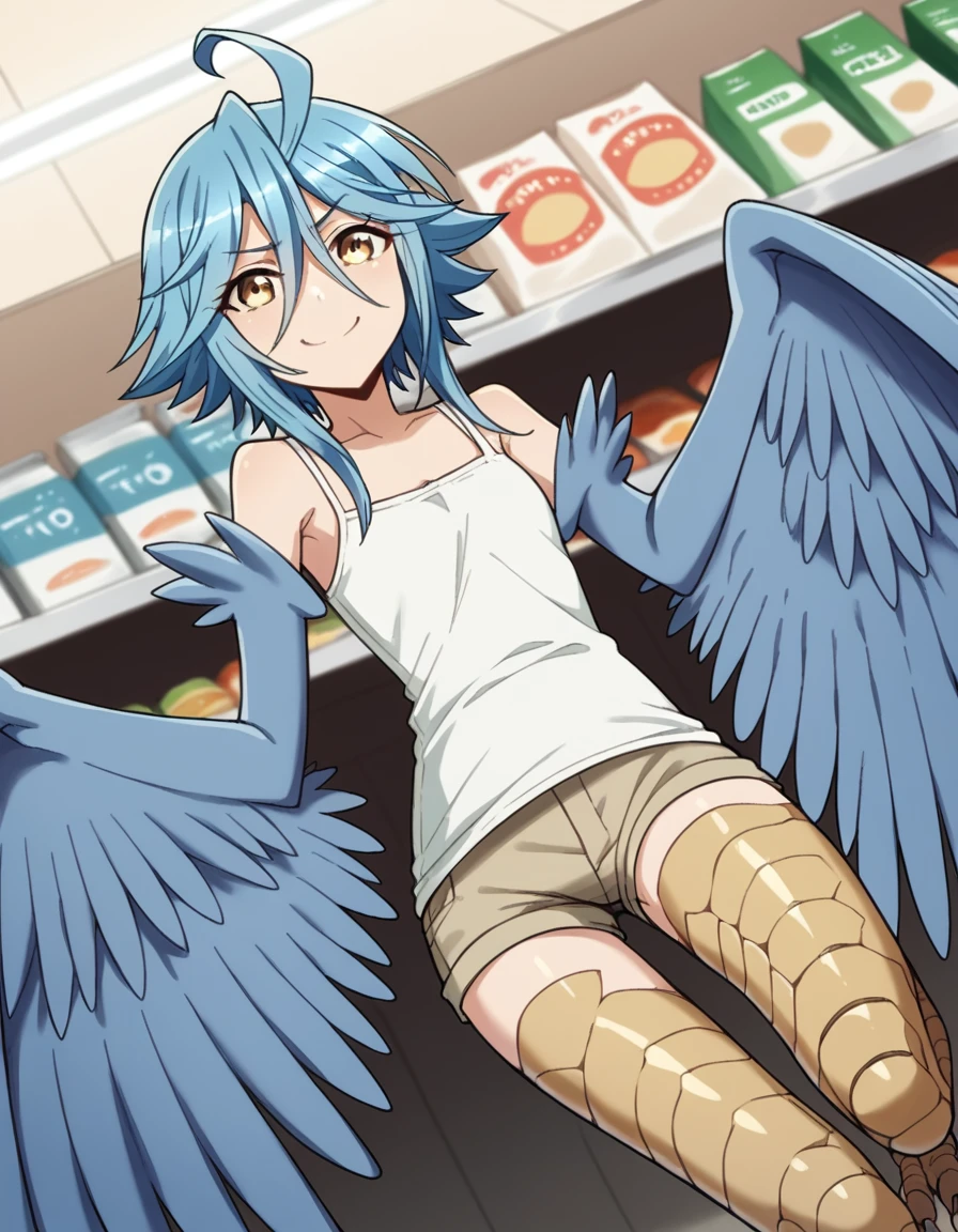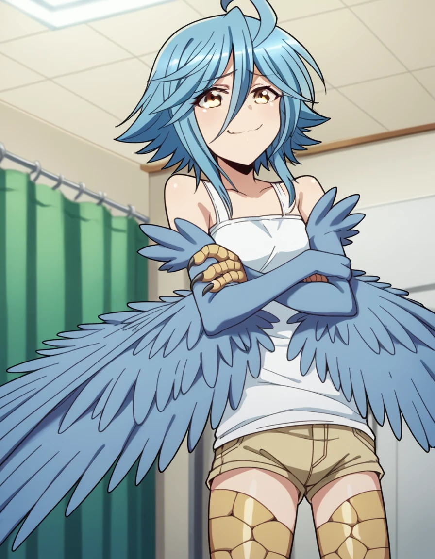 papi, hair between eyes, blue hair, yellow eyes, ahoge, wings, feathers, monster girl, feathered wings, scales, blue wings, harpy, winged arms, talons, bird legs