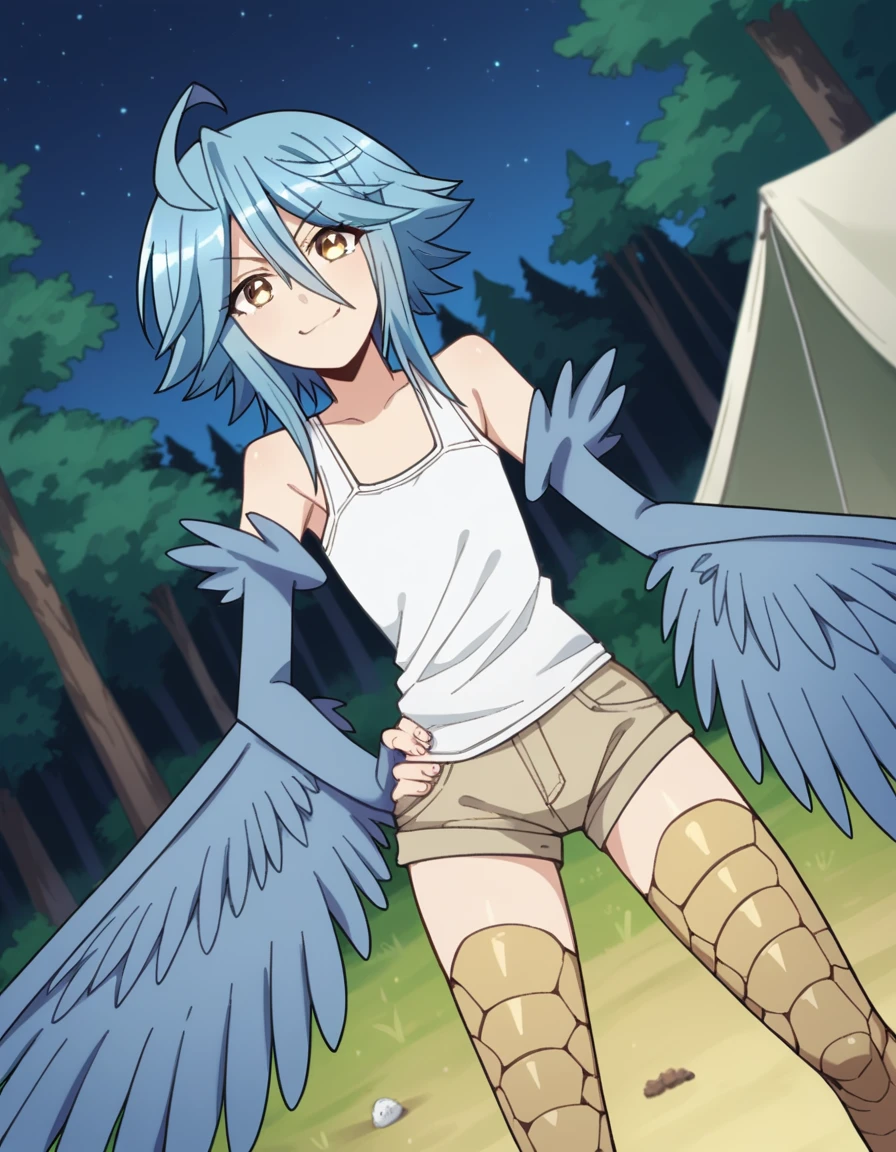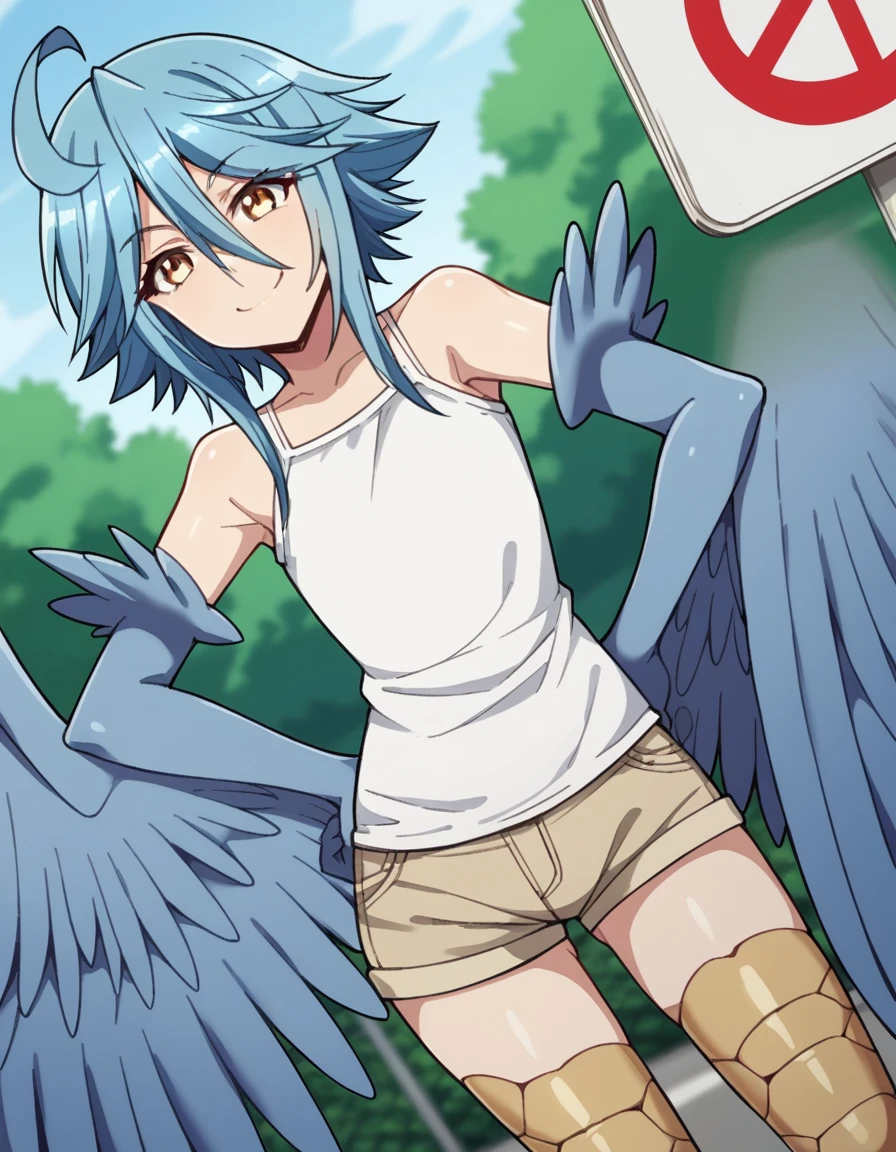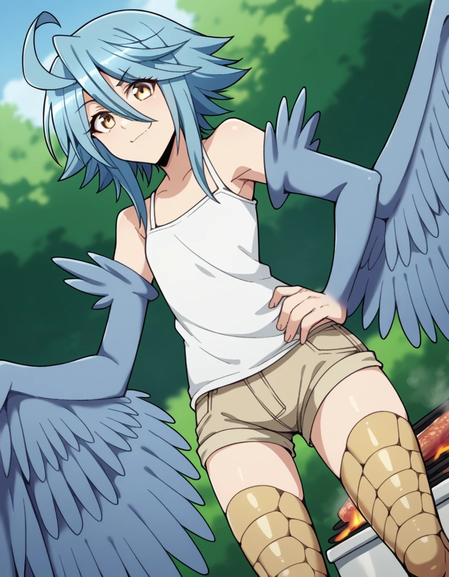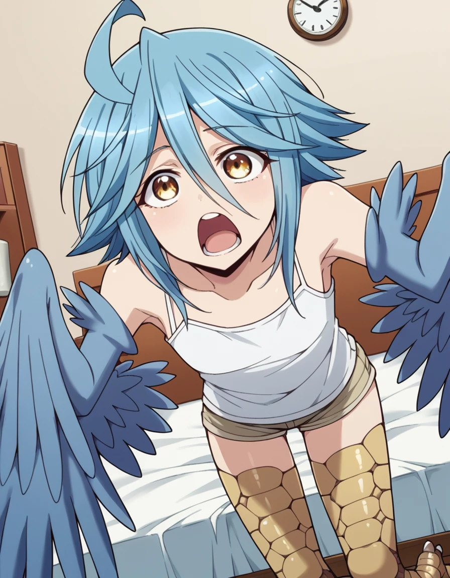 papi, hair between eyes, blue hair, yellow eyes, ahoge, wings, feathers, monster girl, feathered wings, scales, blue wings, harpy, winged arms, talons, bird legs
