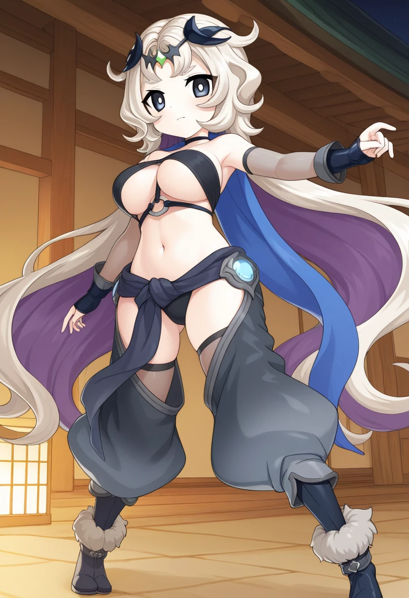 Ninja Costume (Hattori Hanzou) : astaroth\(legend clover\), 1girl, ninja, very long hair, wavy hair, parted bangs, purple hair, grey hair, two-tone hair, colored inner hair, headpiece, circlet, blue eyes, grey eyes, bright pupils, large breasts, cleavage, underboob, bare shoulders, armpits, long scarf, blue scarf, covered navel, black gloves, elbow gloves, fingerless gloves, fishnet leotard, bangle, wrist guards, waist sash, puffy pants, thigh cutout, ass visible through thighs, black panties, rope, fur-trimmed footwear, black thighhighs, jika-tabi, gold trim, o-ring