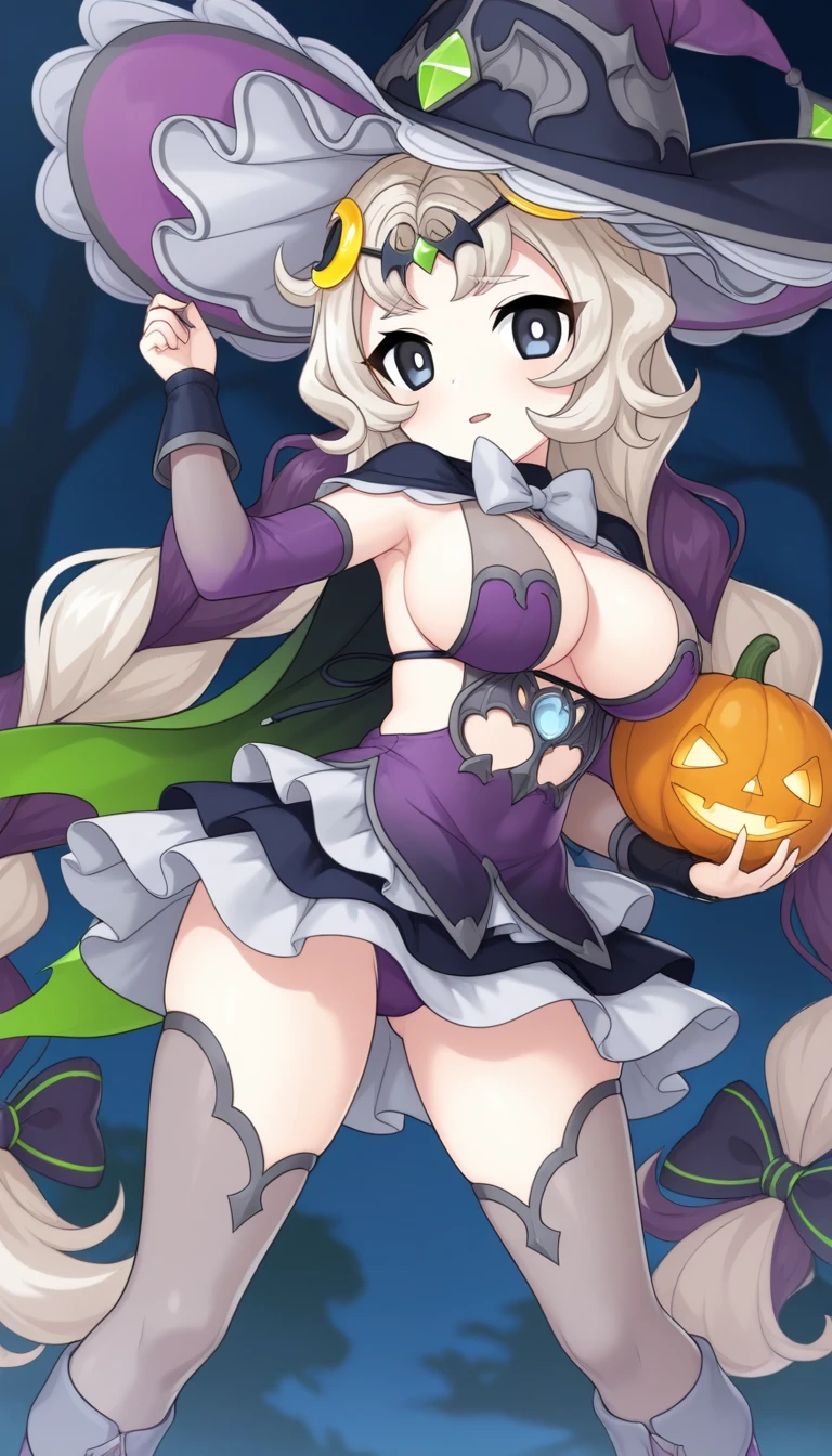 Witch Costume: astaroth\(legend clover\), witchCostume, very long hair, white hair, purple hair, two-tone hair, streaked hair, low twintails, low twin braids, parted bangs, blue eyes, grey eyes, bright pupils, hair bow, black bow, striped bow, multiple hair bows, white bowtie, gem, headpiece, circlet, witch hat, large hat, black headwear, purple headwear, large breasts, cleavage, cleavage cutout, sideboob, bare shoulders, purple dress, sleeveless, long sleeves, wide sleeves, puffy sleeves, frilled sleeves, sleeves past wrists, detached sleeves, purple sleeves, cutout above navel, black capelet, layered skirt, white skirt, black skirt, miniskirt, frilled skirt, grey trim, green cape, torn cape, grey thighhighs, knee boots, purple footwear,