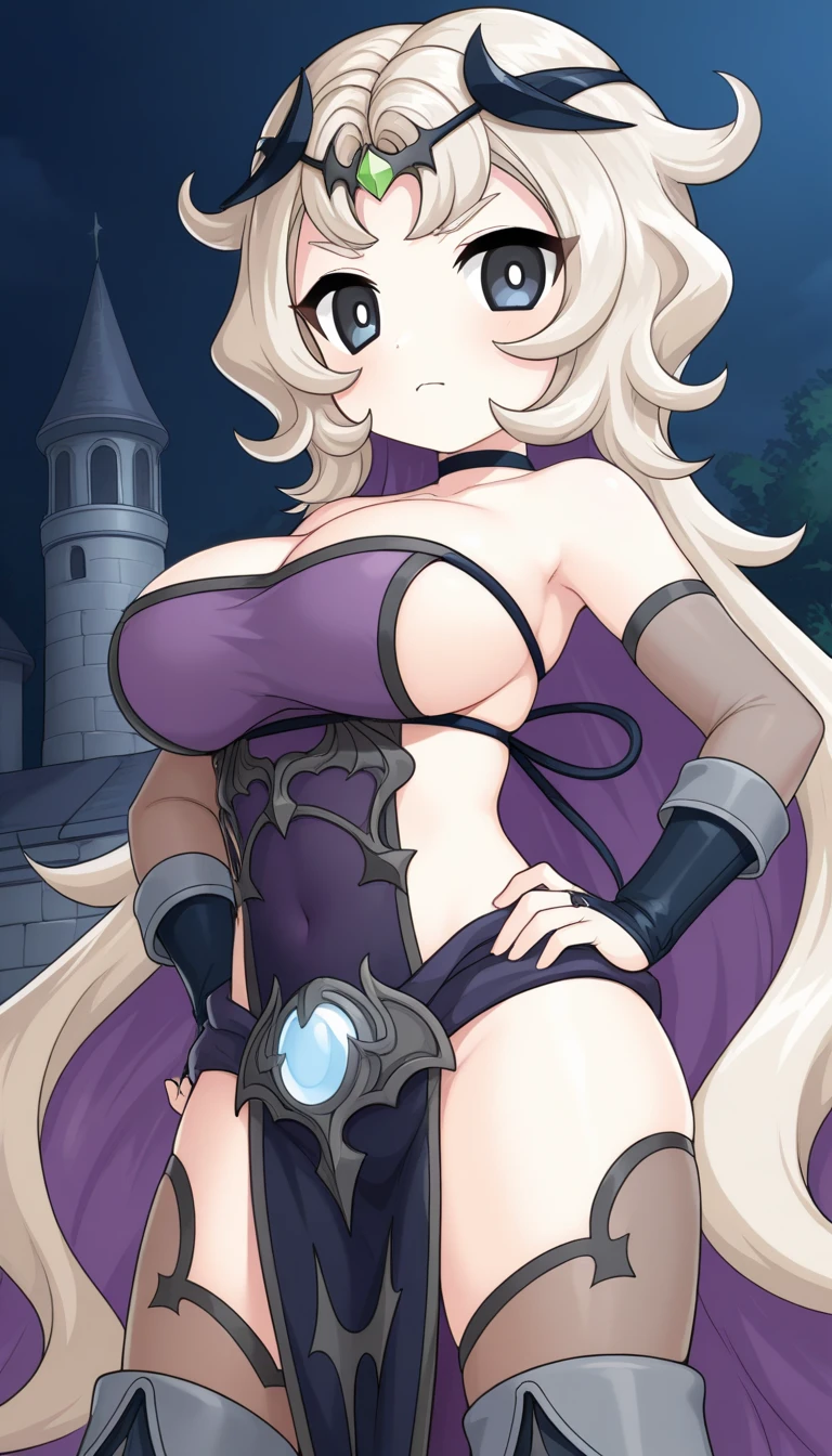 Default Costume: astaroth\(legend clover\), defaultCostume, 1girl, very long hair, wavy hair, parted bangs, purple hair, grey hair, two-tone hair, colored inner hair, headpiece, circlet, blue eyes, grey eyes, bright pupils, large breasts, cleavage, sideboob, bare shoulders, purple dress, vambraces, detached sleeves, black gloves, fingerless gloves, black choker, see-through, covered navel, pelvic curtain, sideless outfit, black trim, brown thighhighs, thighhighs under boots, thigh boots, black footwear, armor,