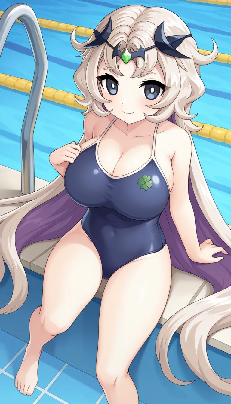 Swimsuit Costume (Hades): astaroth\(legend clover\), swimsuitCostume, 1girl, very long hair, wavy hair, parted bangs, purple hair, grey hair, two-tone hair, colored inner hair, headpiece, circlet, blue eyes, grey eyes, bright pupils, large breasts, cleavage, bare shoulders, collarbone, blue swimsuit, one-piece swimsuit, competition school swimsuit, taut swimsuit, bare arms, covered navel, four-leaf clover, bare legs, barefoot, feet, toes,