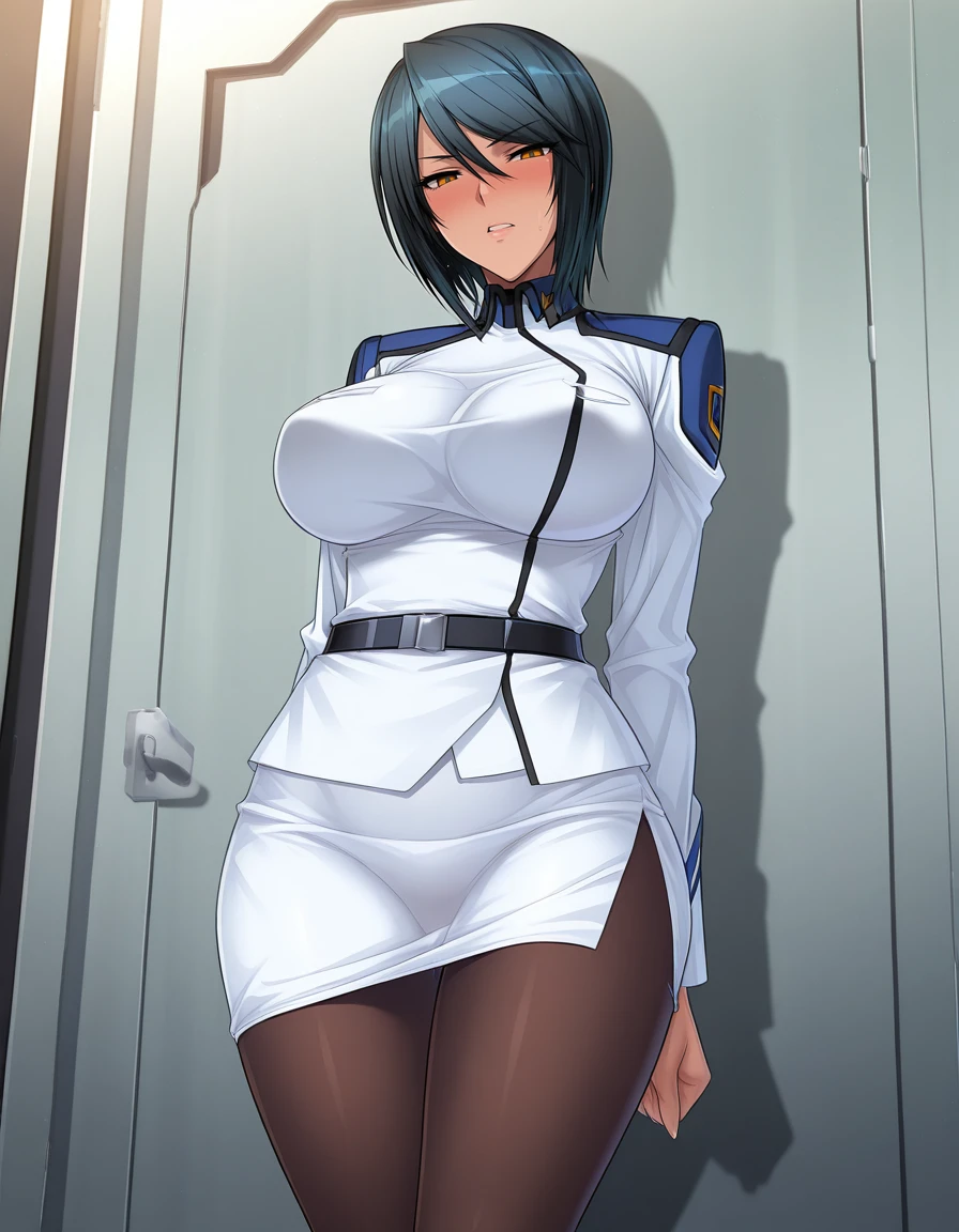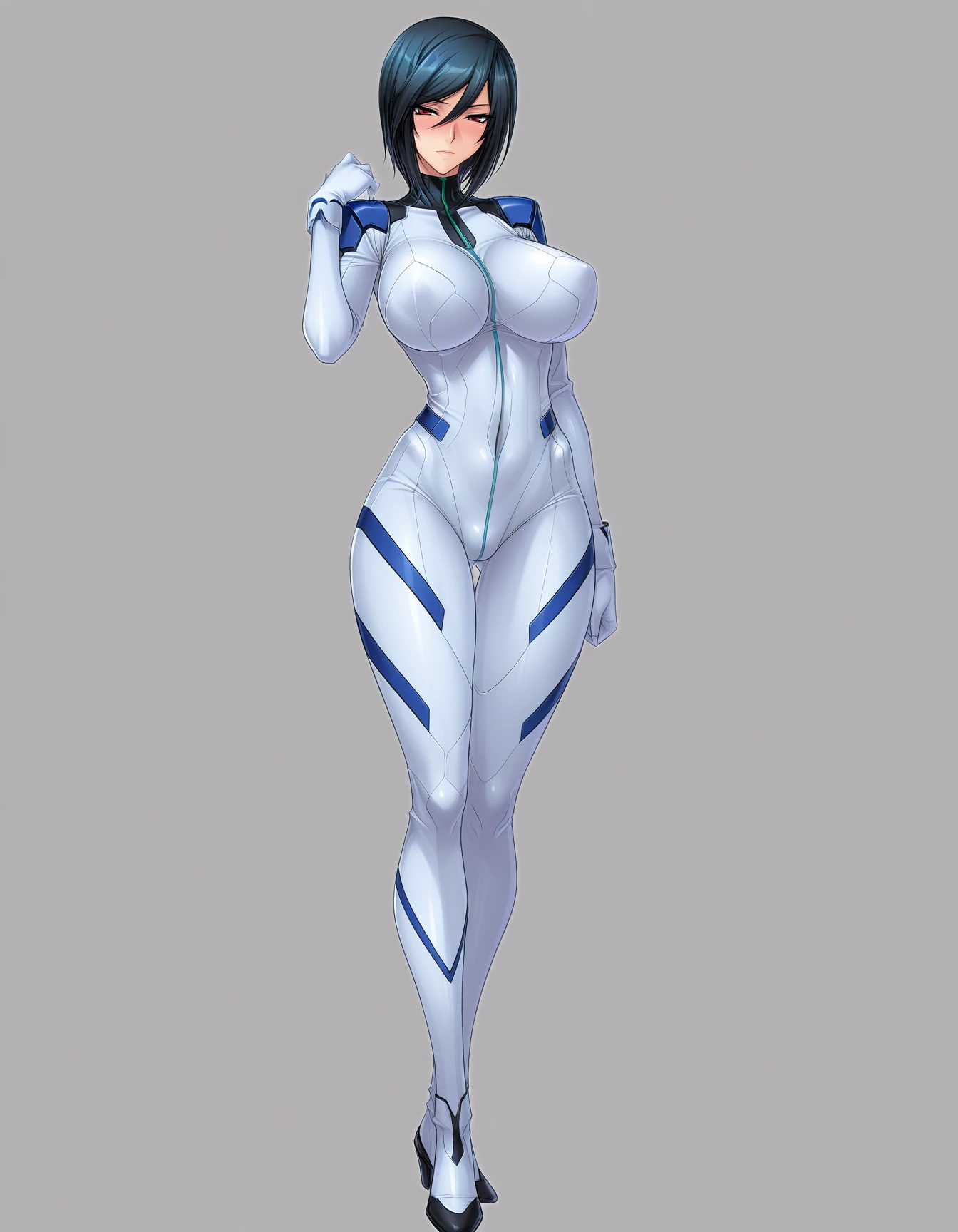 mai_pbg3,mai_naomi,short_hair,black_hair,red_eyes,large_breasts,skin_tight,science_fiction,pilot_suit,white_bodysuit