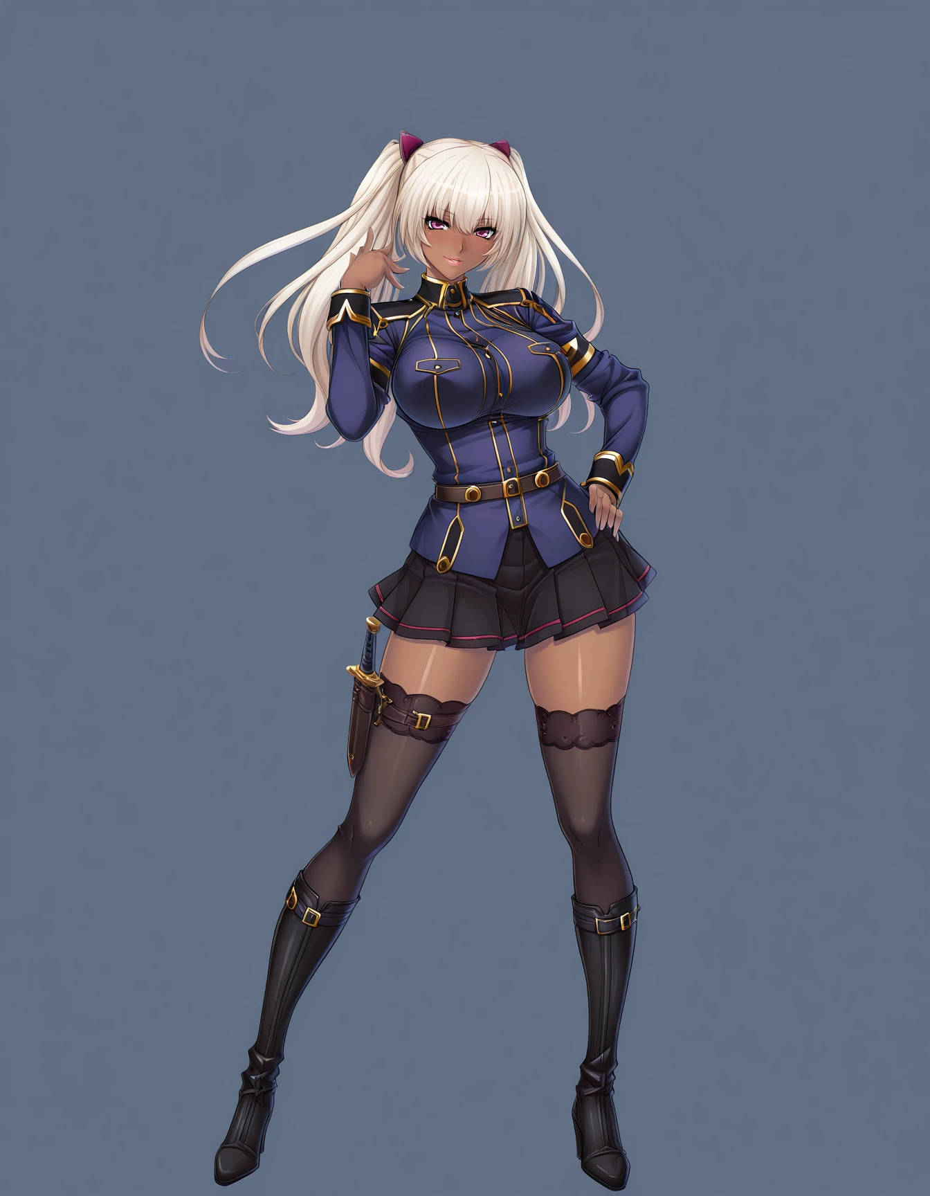 mai_pbg3,mai_kila,dark-skinned_female,long_hair,twintails,blonde_hair,pink_eyes,hair_between_eyes,large_breasts,makeup,hair_ornament,military_uniform,black_skirt,belt,black_thighhighs,thigh_strap,knee_boots,high_heel_boots