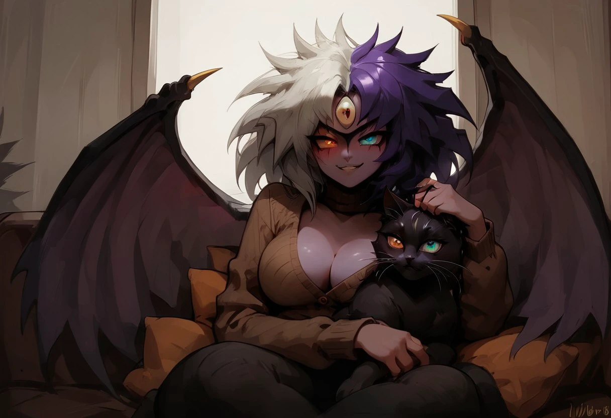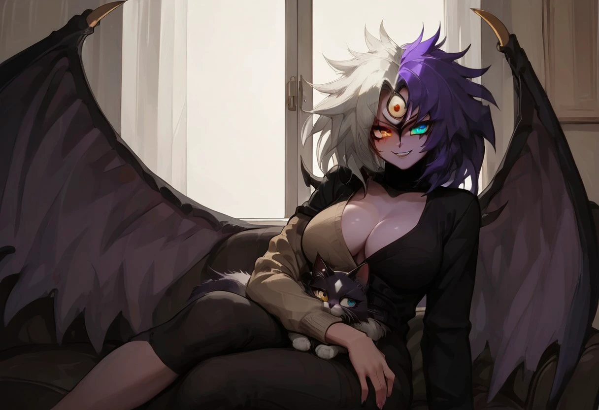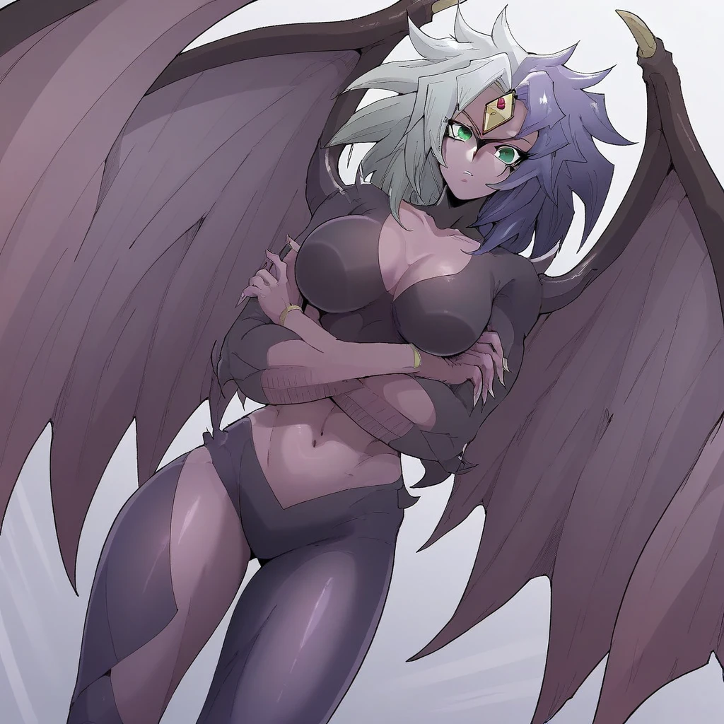 Yubel, Wings, Two tone hair, gray-purple skin, heterochromia, detailed eyes,